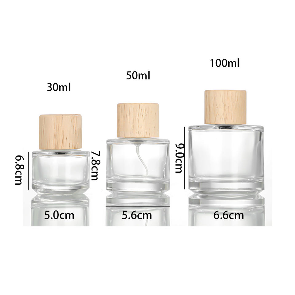 Flacon de parfum et de mascara en verre de luxe de 30 ml et 50 ml, base lourde, bouchon en bois, cylindre rechargeable, flacon de parfum vide en verre