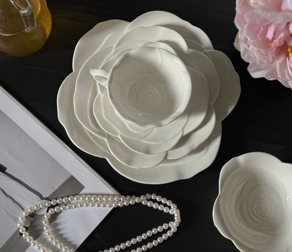 Service de table en céramique blanche de luxe avec motifs de roses en 3D - Assiettes, bols et tasses élégants en porcelaine pour restaurants, mariages, vente en gros