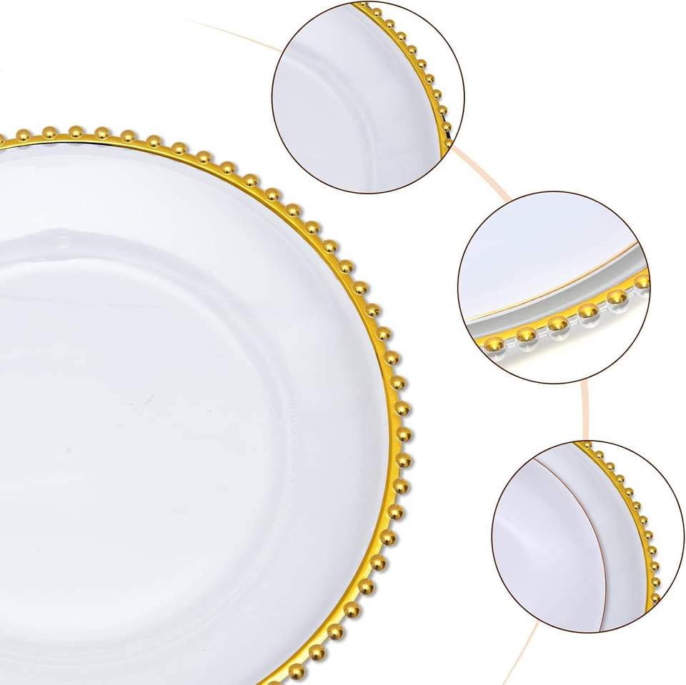 Plaque de chargeurs de vaisselle transparente de luxe de 8 pouces 13 pouces à bord doré pour la location de mariage