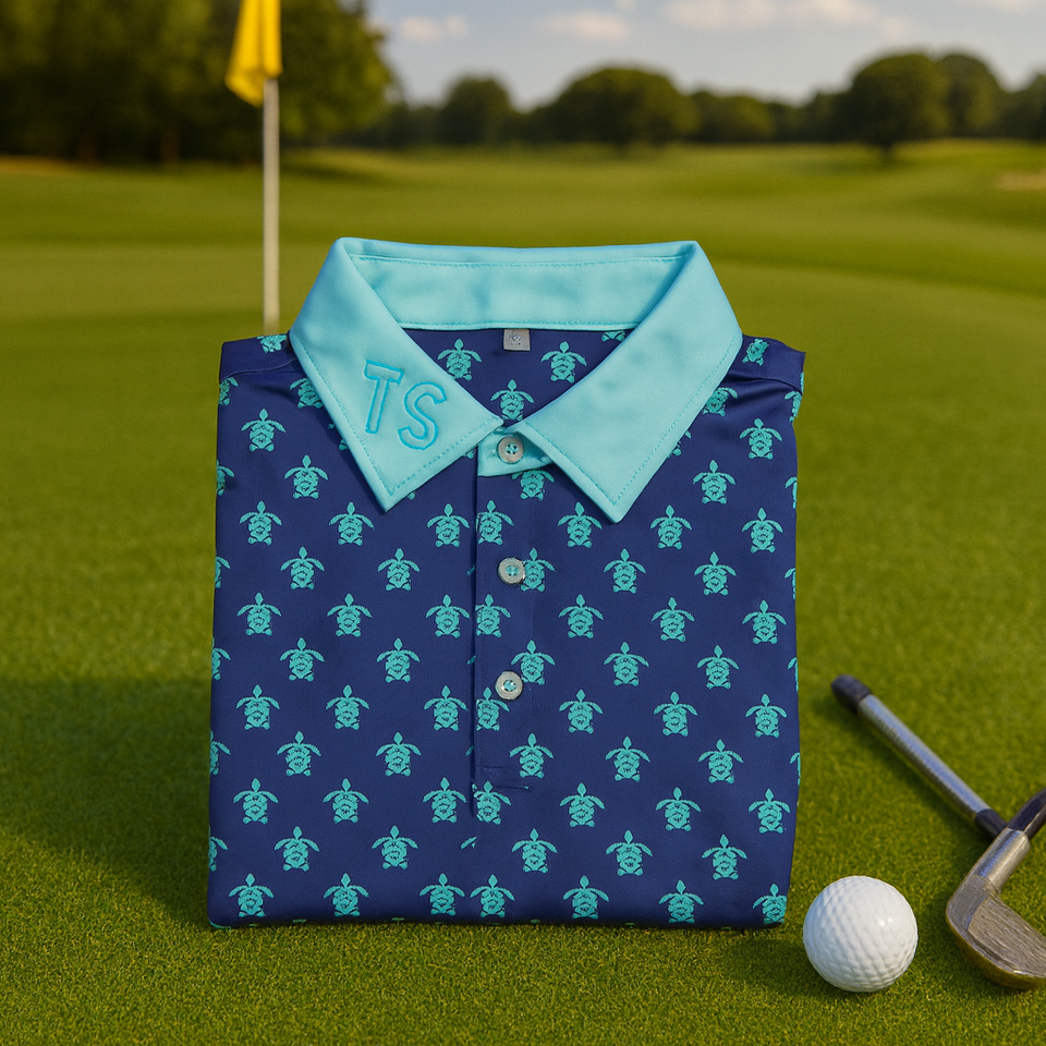 Luxe 80% Polyester 20% Spandex Sublimation de haute qualité Bleu marine Partout Tortue Design Polo de golf Logo personnalisé