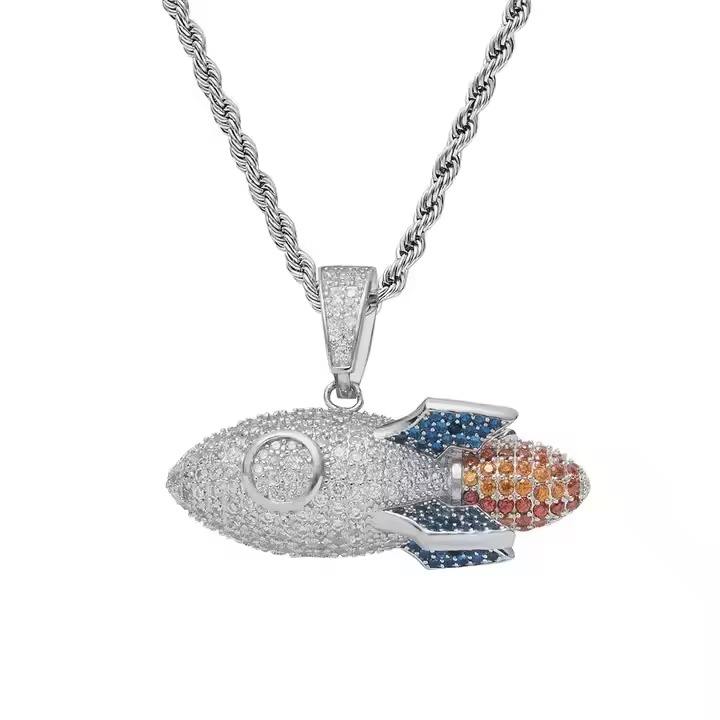 Pendentif fusée de luxe en argent 925 de 1 pouce avec des accents de diamant Moissanite coupe ronde colorée breloque de collier Hip Hop à la mode