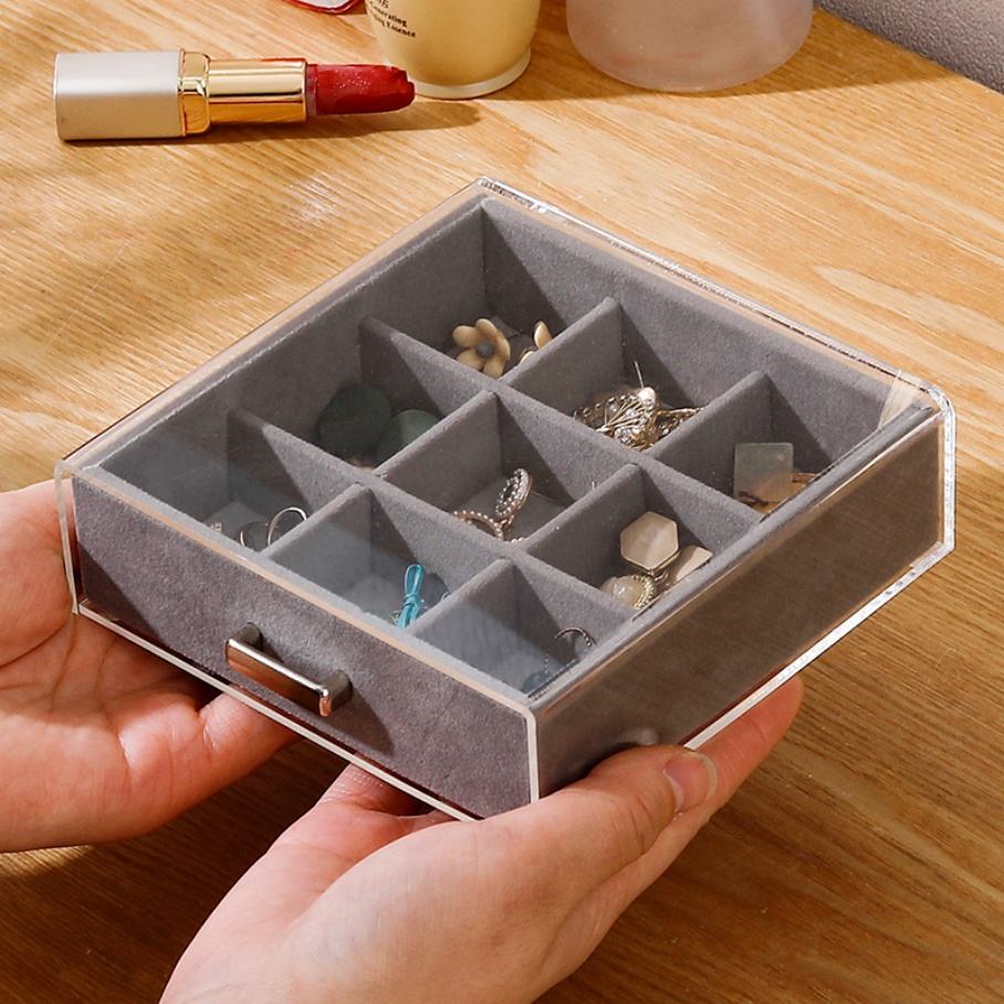 Boîte à bijoux en velours acrylique transparent de luxe pour bagues, boucles d'oreilles, bracelets, accessoires, présentoir anti-poussière 13*13*11.5cm