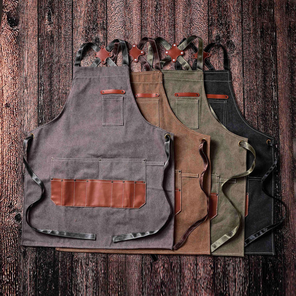 Tabliers en toile et cuir réglables de luxe Accessoires de cuisine Chef Cooking Tablier de barbecue soudeur lavable avec poches AAA-0042C