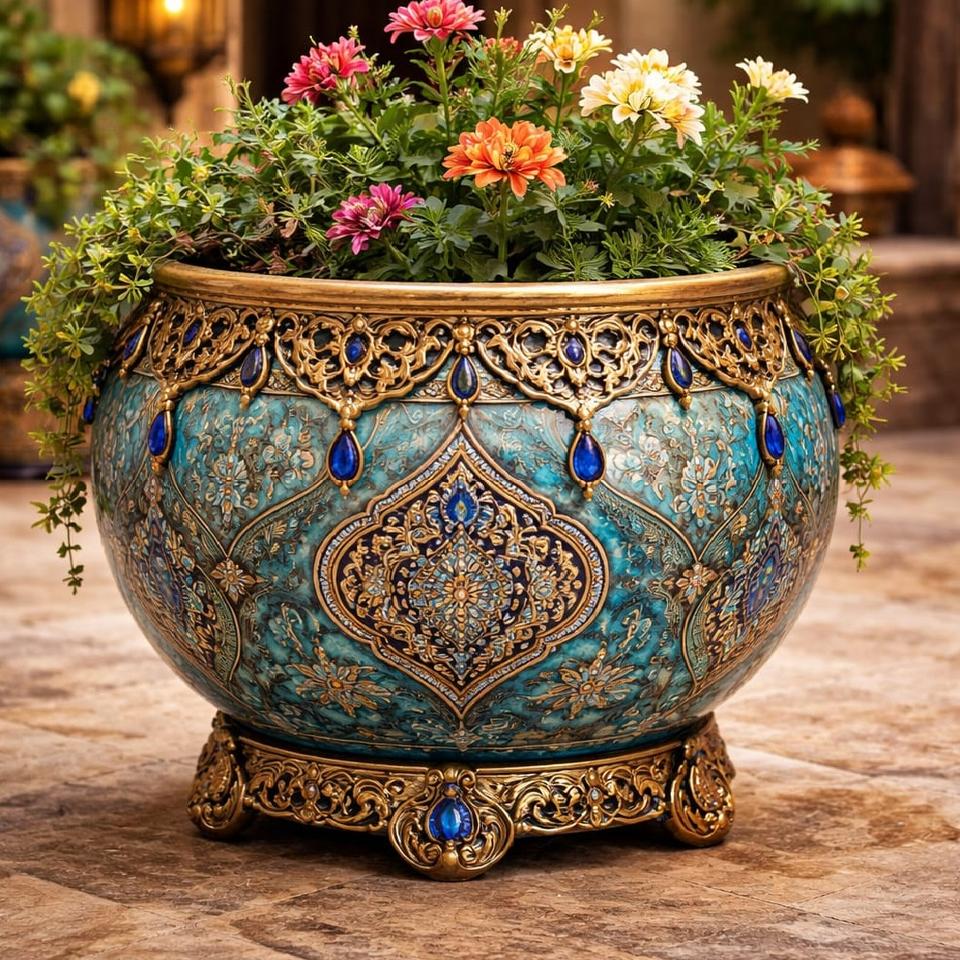 Bol à plantes décoratif en métal de style marocain, style arabe de luxe, avec finition or antique, décoration pour la maison et le jardin