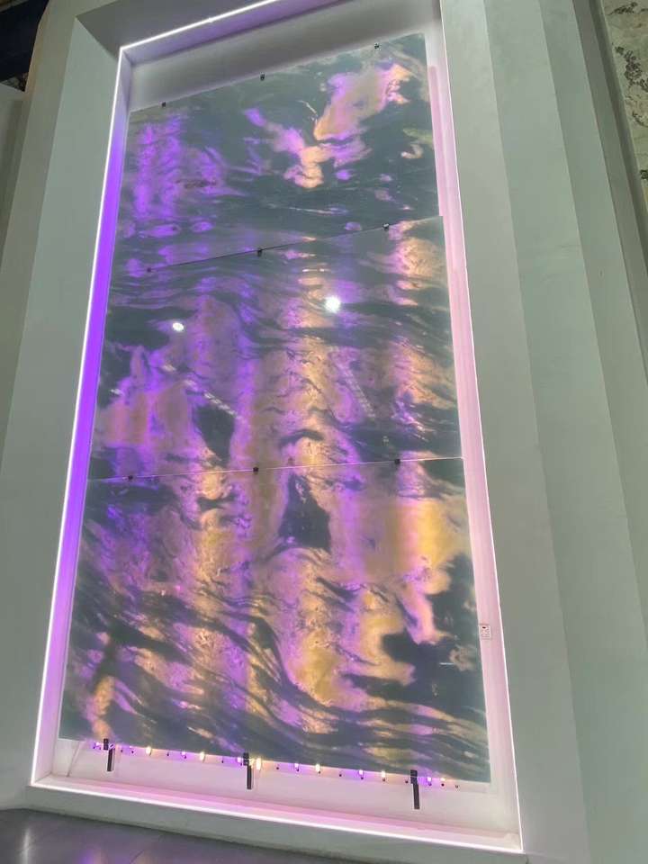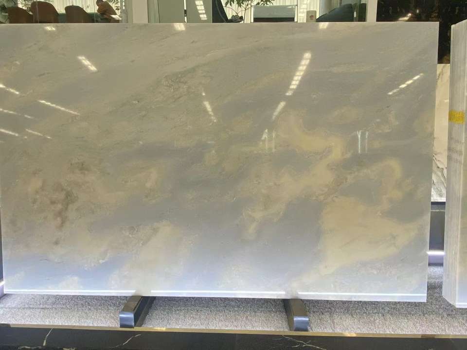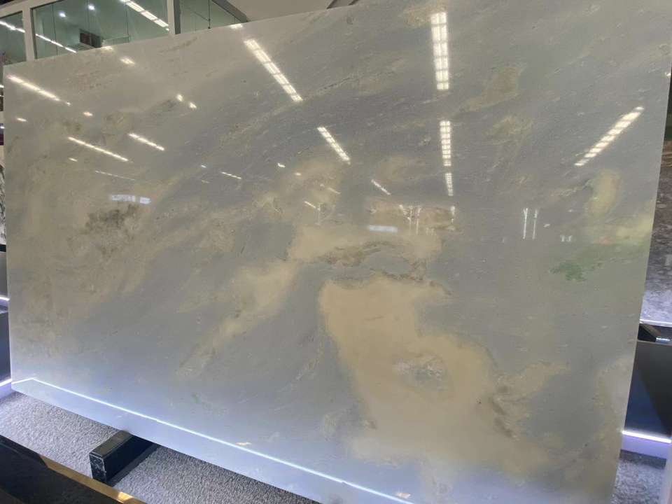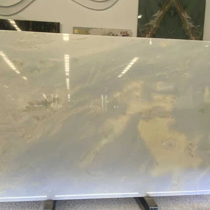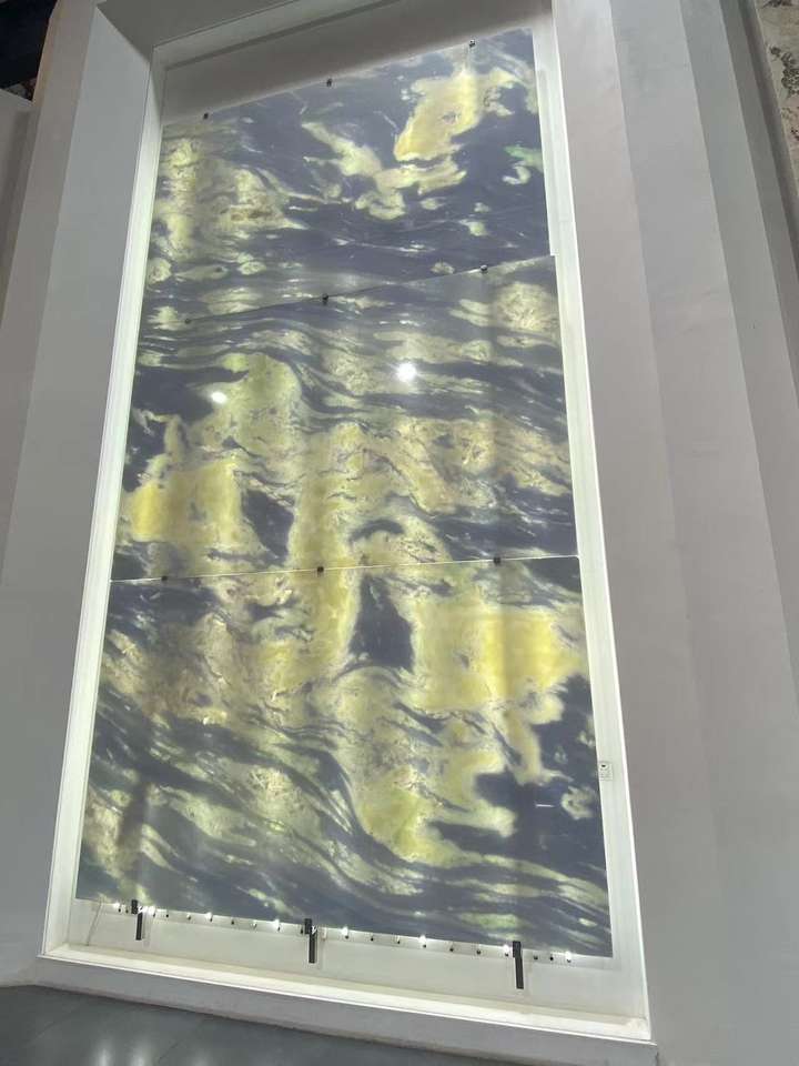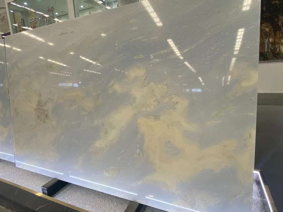 Travertin de luxe de qualité artistique, bleu dégradé, à veines uniques, bleu ciel, blanc jade, poli pour cuisine et salle à manger modernes et minimalistes