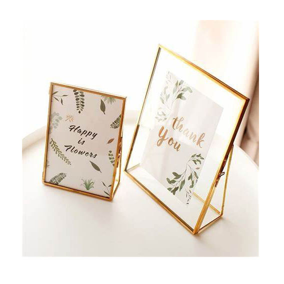 Luxe Meilleure Vente Métal Laiton Bordure Verre Clair Cadre Photo Fleur Pressé Porte-Photo Or Fini Table De Mariage Déco