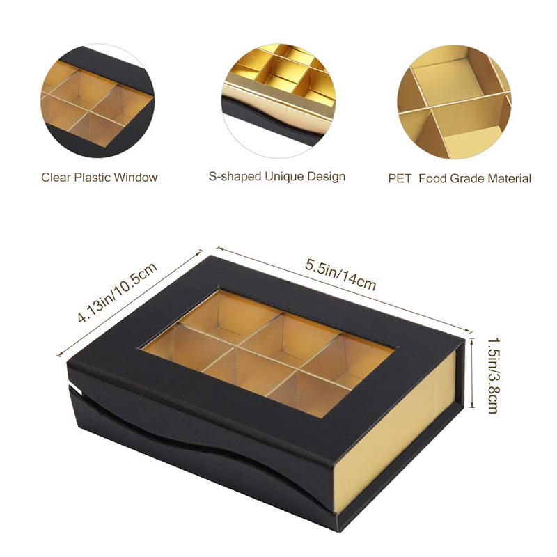 Boîte de papier cadeau de chocolat rigide noir de luxe vide avec fenêtre transparente avec stratification mate et impression de gaufrage