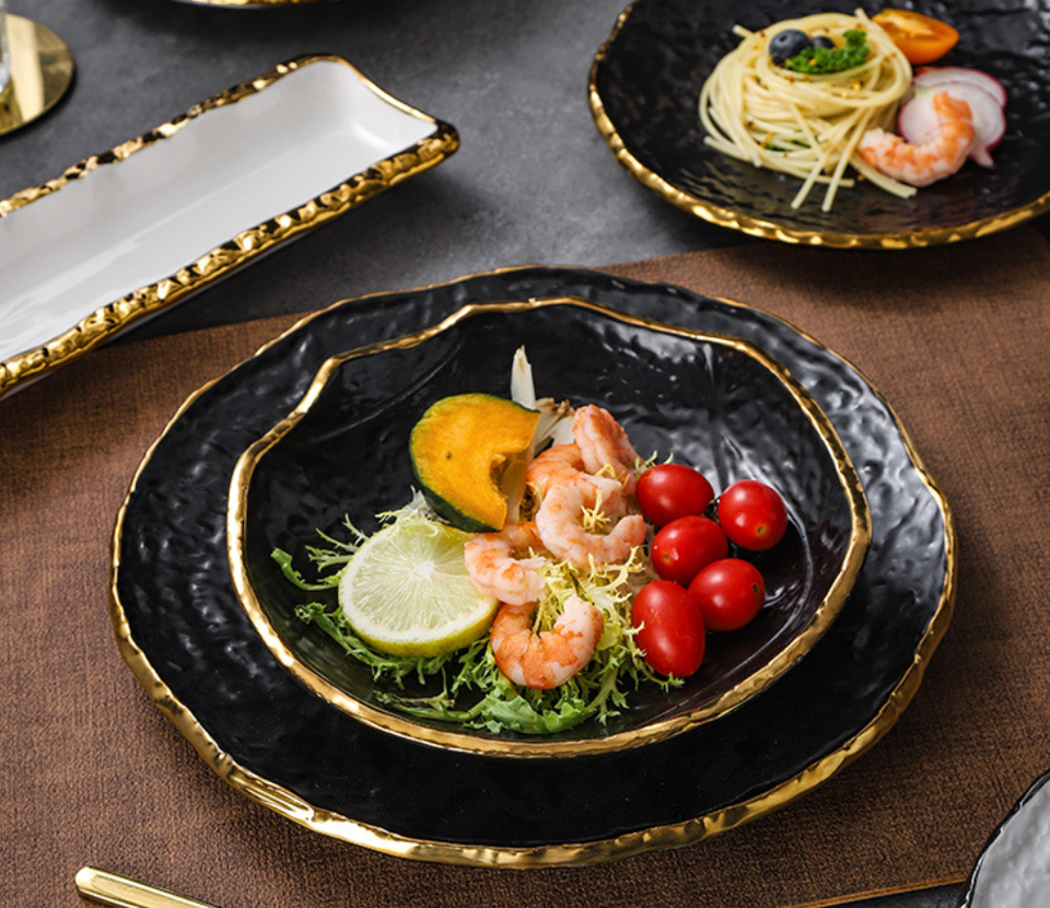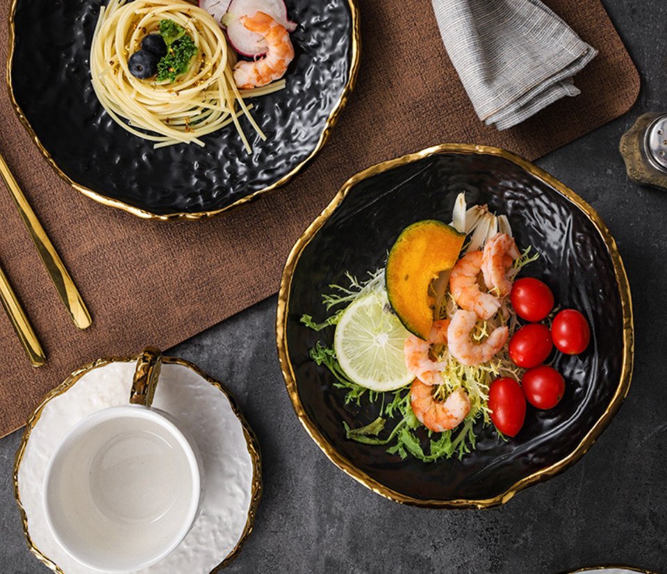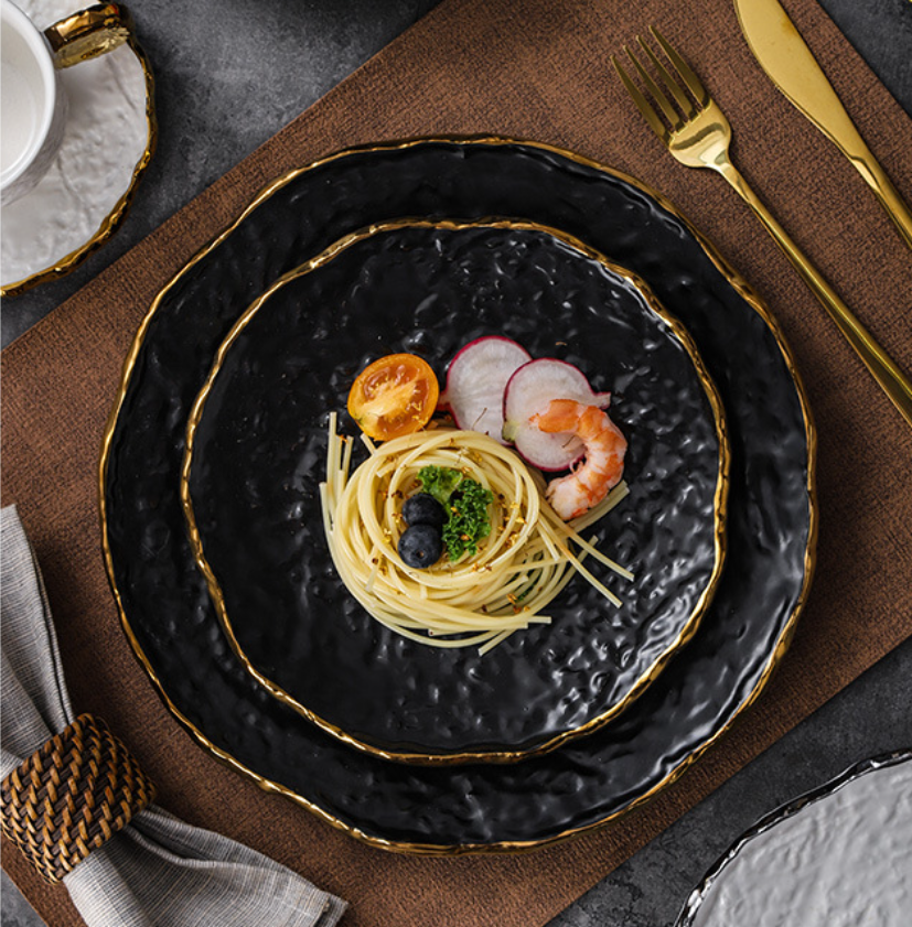 Service de vaisselle en céramique texturée martelée, noir, blanc et or, luxe, assiettes, bols, tasses, pour restaurant, hôtel, mariage, cadeau