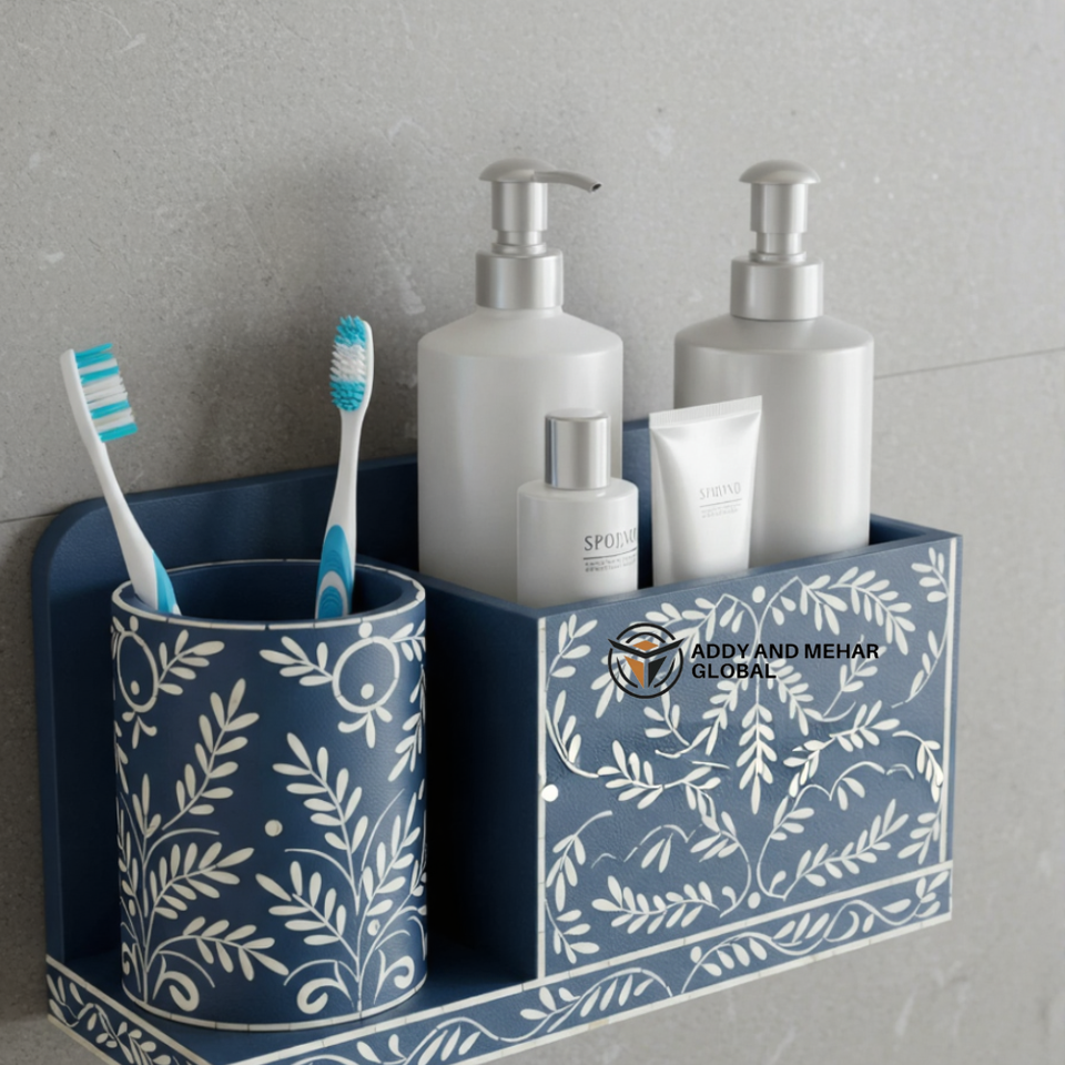 Organisateur de salle de bain mural rectangulaire de luxe bleu en os incrusté, deux pièces, écologique, facile à nettoyer, motif floral, étagère de rangement