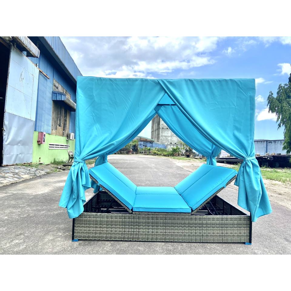 Lit de bronzage extérieur en rotin bleu de luxe avec dossiers et auvent réglables pour chaises longues