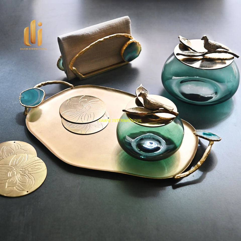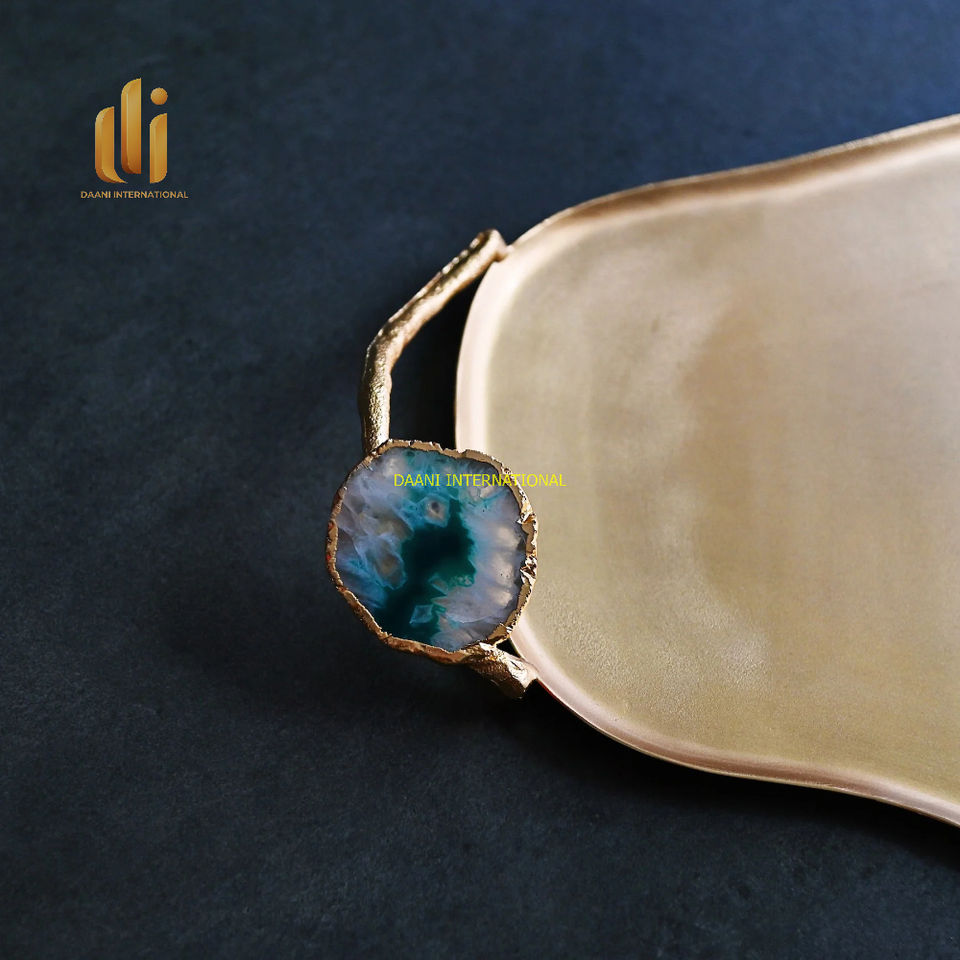 Plateau de service en laiton de luxe avec poignées en pierre d'agate naturelle plateau de boisson alimentaire décoratif fait à la main pour salle à manger cuisine décor à la maison
