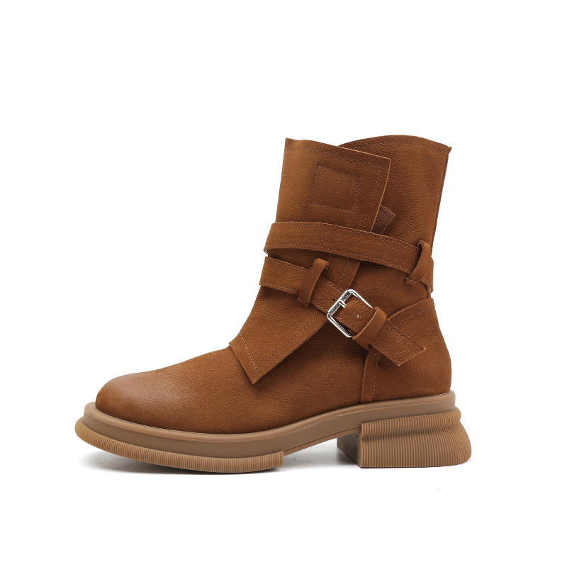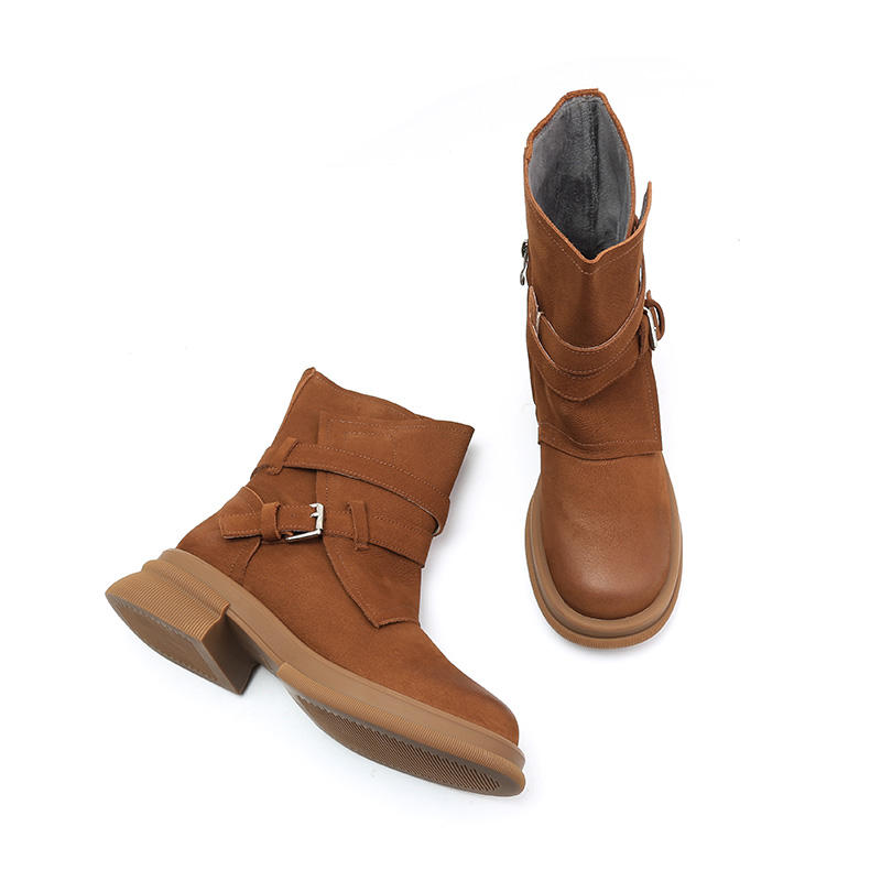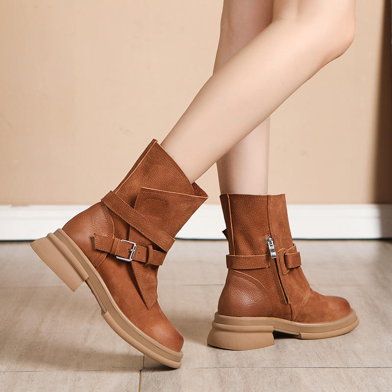 Bottines de luxe rétro britanniques en cuir de vachette, confortables, printemps automne hiver, grandes tailles, marron, fourrure douce, antidérapantes, style western, fermeture éclair, boucle, talon 4,5 cm