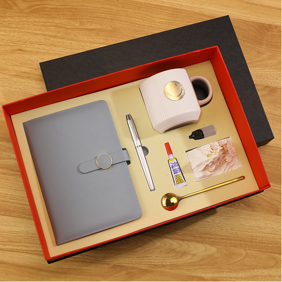Coffret cadeau professionnel de luxe avec tasse en céramique, boîte cadeau A5 en cuir PU, stylo et cuillère boîte cadeau de papeterie de bureau avec logo personnalisé