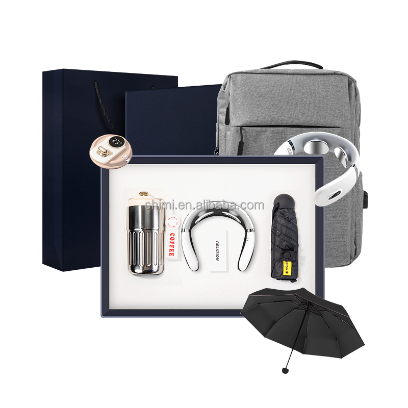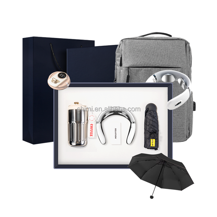 Coffret de cadeaux d'affaires de luxe mug + masseur de cou + mini parapluie + sac à dos bureau flacon d'entreprise coffret cadeau pour homme