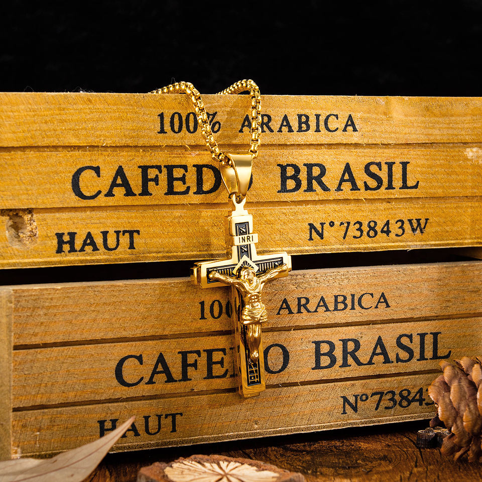 Luxury Catholic Jesus Christ on INRI Gold Plated 22 Inches Cross Crucifix Steel Pendant Chain Men's Necklace Religious Jewelry
