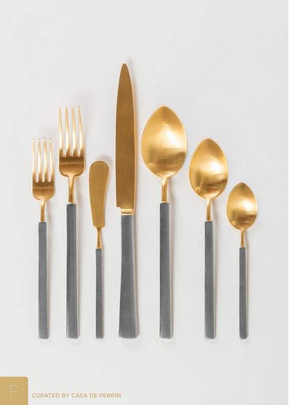 Ensemble de couverts au design classique de luxe en acier inoxydable avec finition dorée, parfait pour les repas au restaurant et la table élégante