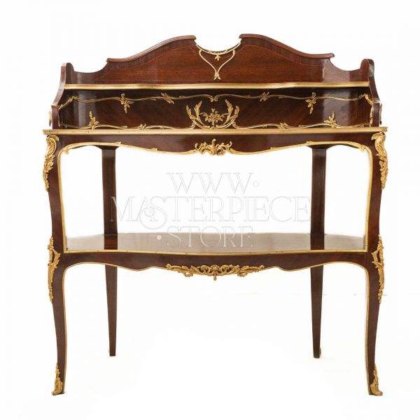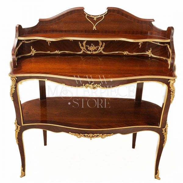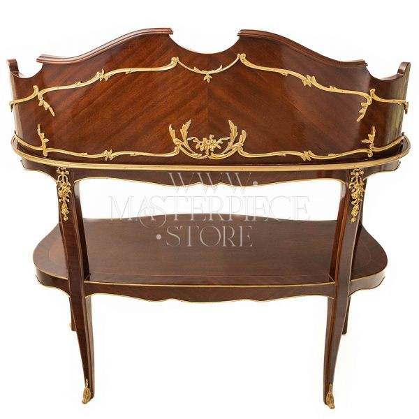 Table console classique de luxe en bois avec étagères de présentation supérieures et accents en laiton