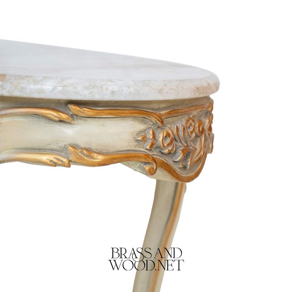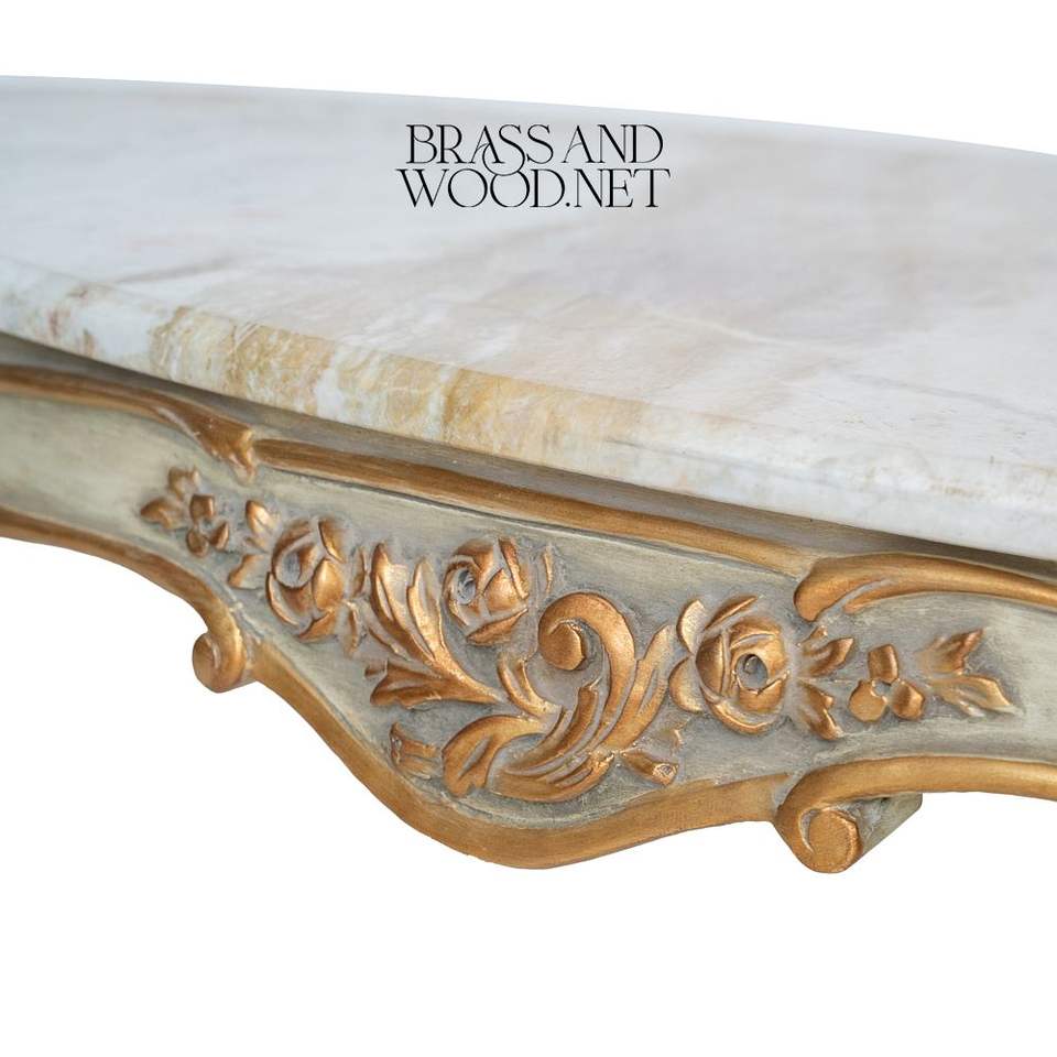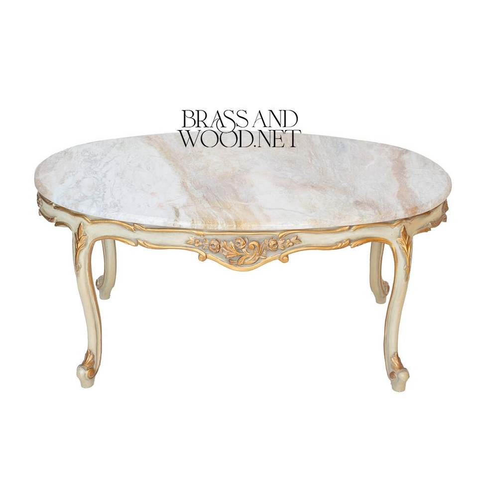 Table basse classique de luxe avec plateau en marbre blanc, pieds sculptés en or ornés, finition élégante de style européen