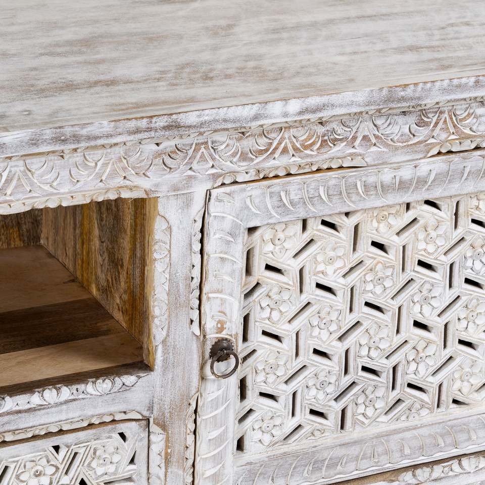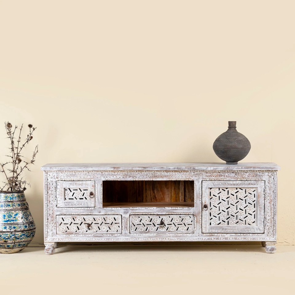 Meuble TV convertible de luxe extensible en bois massif, style ferme moderne, pour salon, avec rangement et sculptures