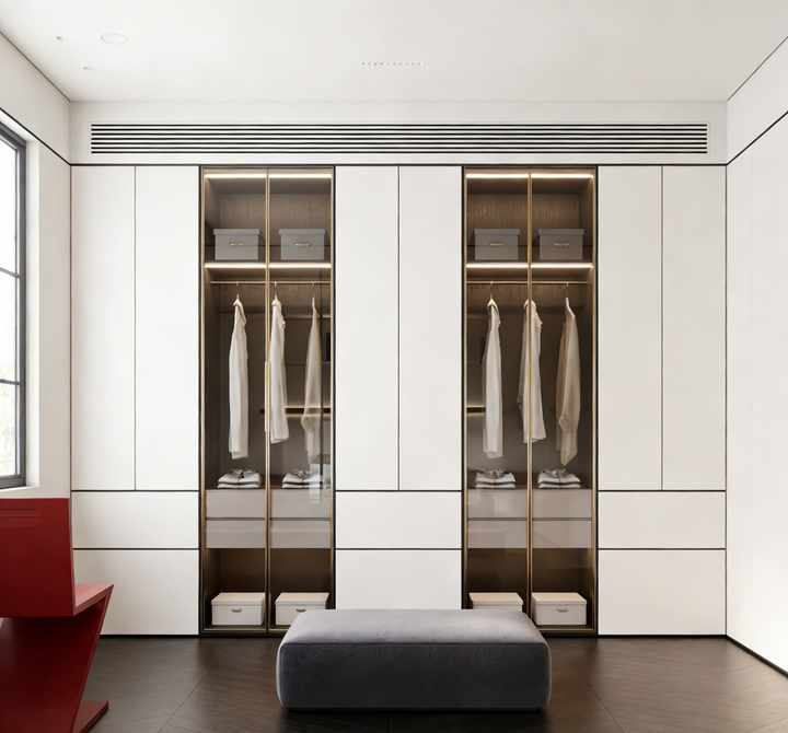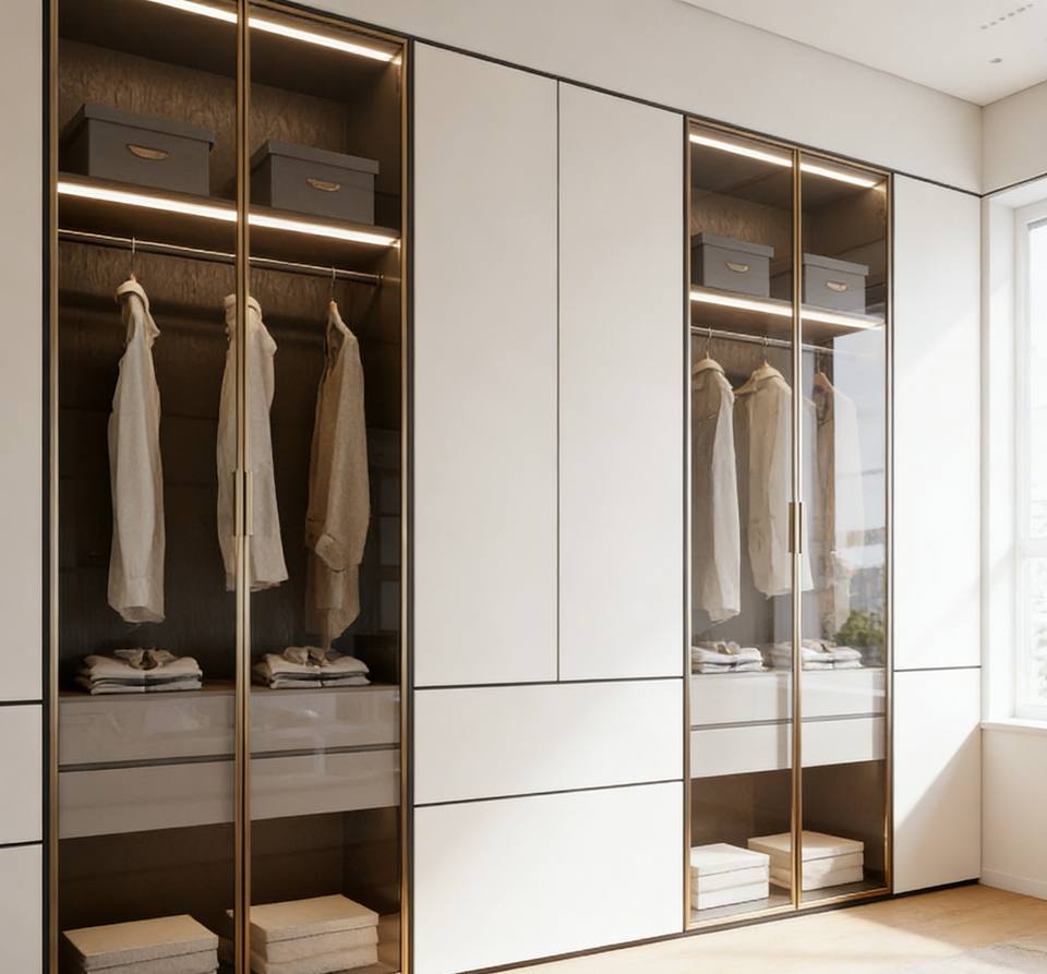 Dressing sur mesure de luxe avec portes en verre à finition dorée et éclairage intégré pour maison et appartement