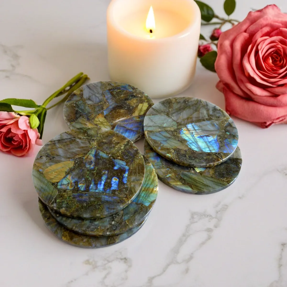Sous-verre de luxe personnalisé en marbre labradorite, meilleur prix, rond, blanc et jaune, pour boissons