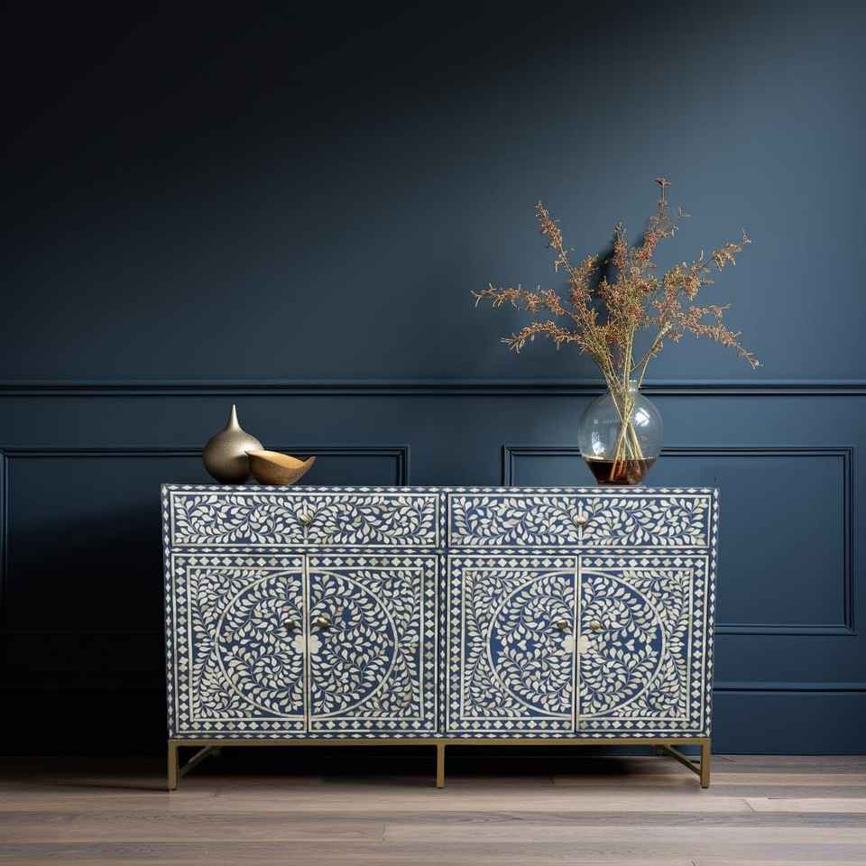 Meuble de salon de luxe sur mesure au design moderne avec incrustations en os, fabriqué par Novelty Furniture India