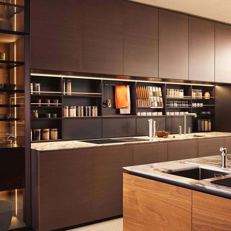 Armoires de cuisine de luxe sur mesure au design moderne, finition résistante à l'humidité, bois massif, acier inoxydable, évier en granit, dosseret