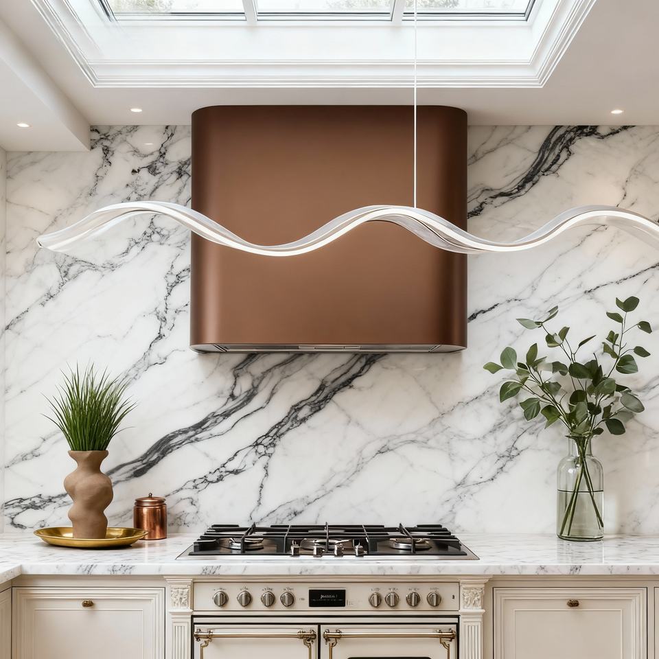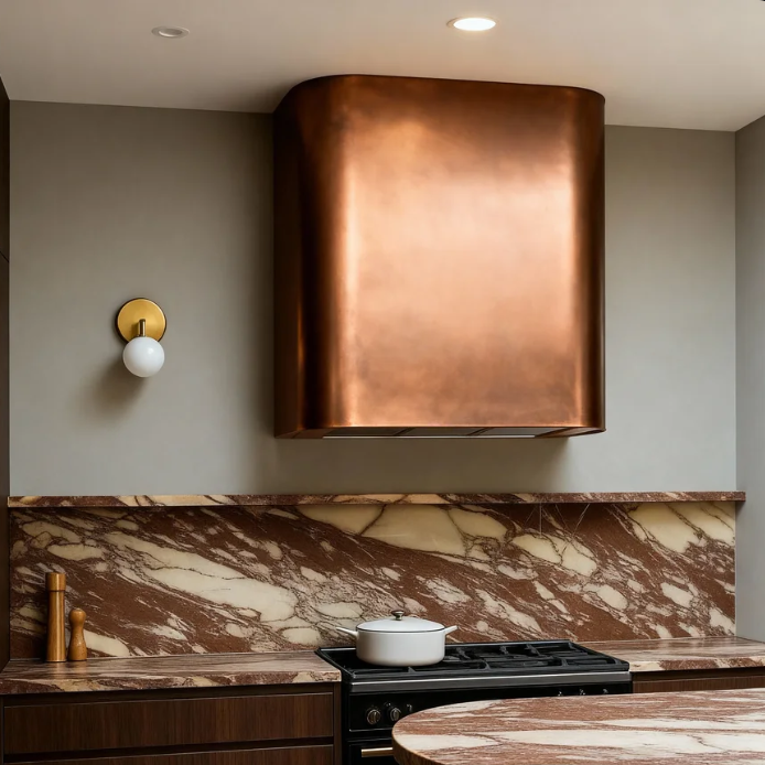 Hotte aspirante murale de luxe sur mesure en acier inoxydable or rose, design incurvé, sur mesure pour résidentiel