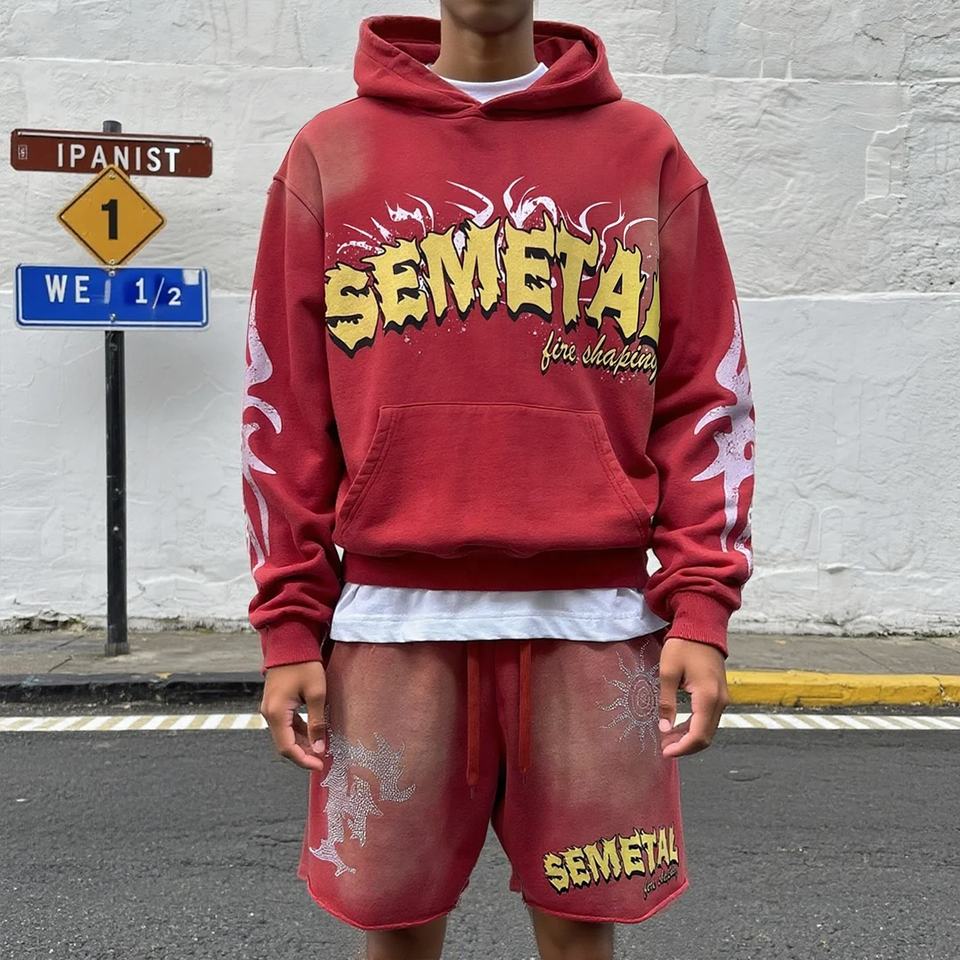 Ensemble de survêtement de luxe personnalisé en deux pièces, imprimé sérigraphié, en coton épais, avec sweat à capuche et short, coupe oversize, effet délavé et strass