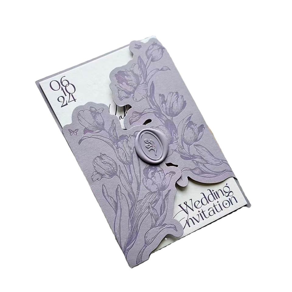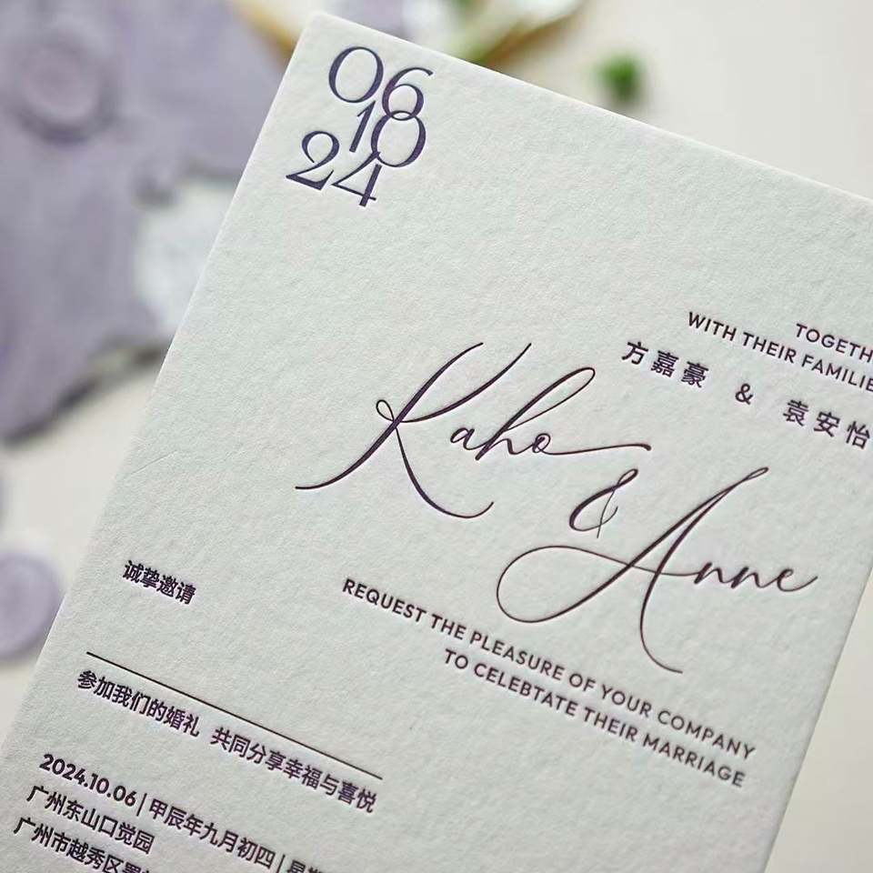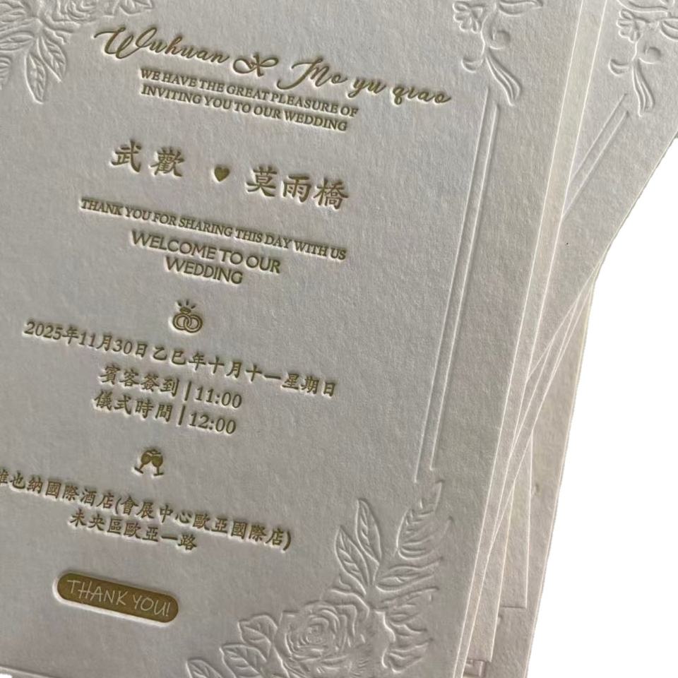 Carte d'invitation de mariage personnalisée de luxe avec estampage à chaud doré et design en relief, impression typographique sur carton et papier d'art