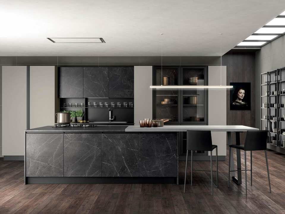 Armoires de cuisine en acier inoxydable foncé de luxe avec lumières, design moderne de Foshan, panneau de porte personnalisé pour toute la maison, traitement de surface laqué