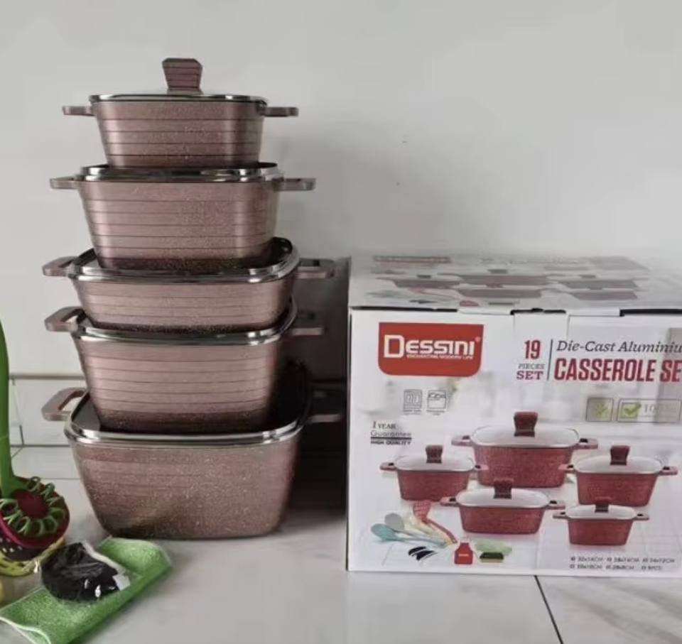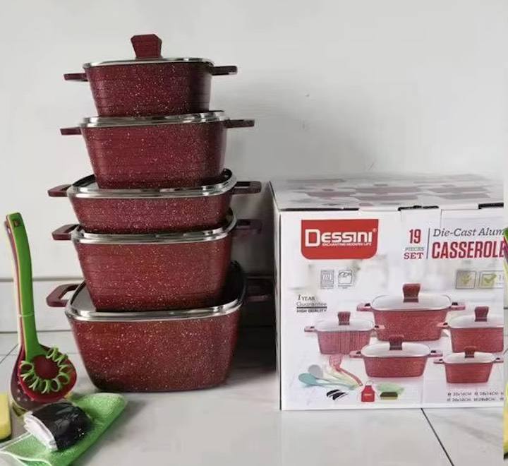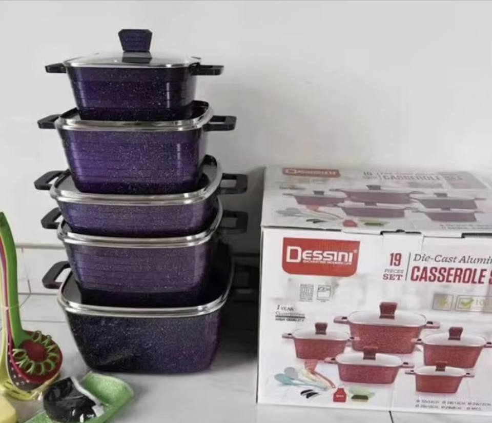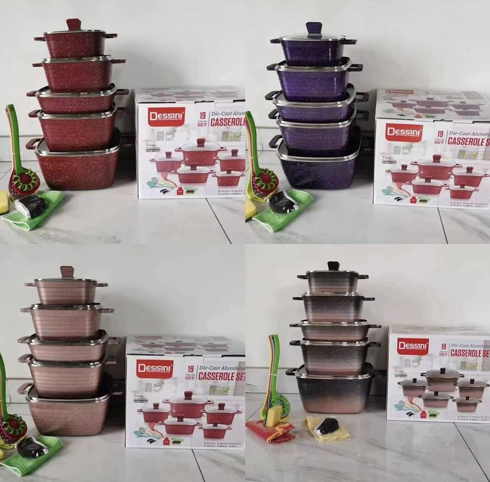 Ensemble de casseroles en aluminium de luxe 19 pièces, design carré, revêtement granit violet, rouge, noir, avec ensemble d'ustensiles de cuisine 9 pièces