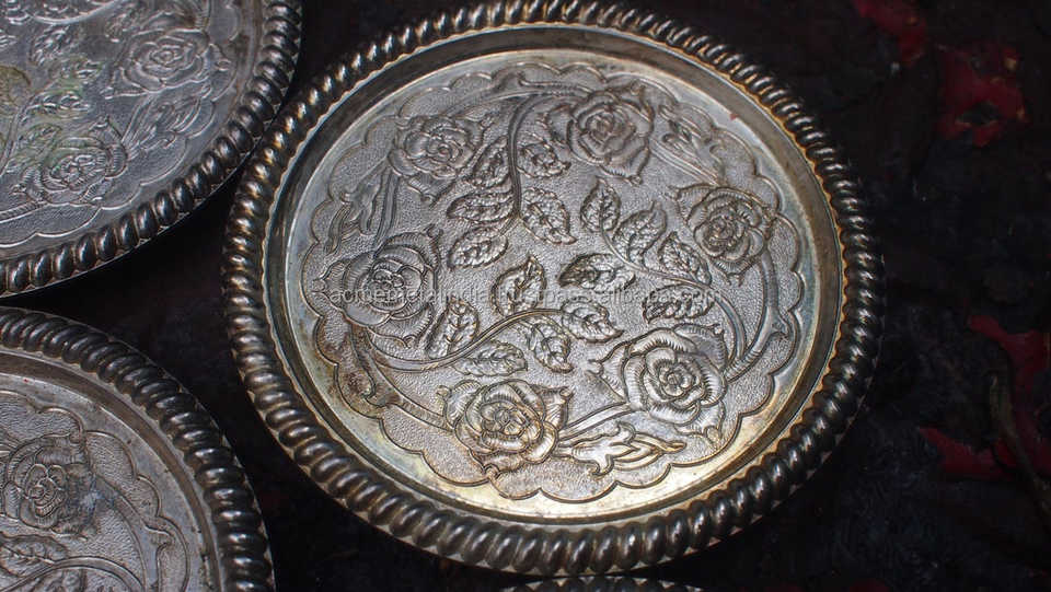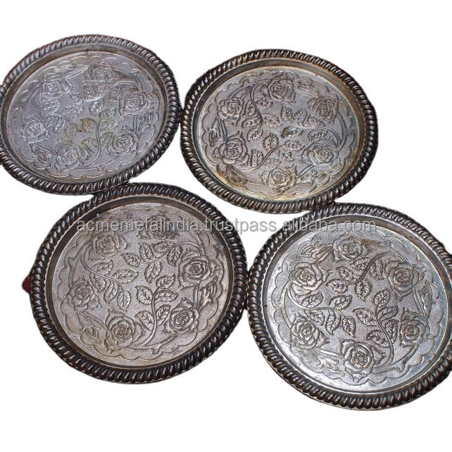 Ensemble de 4 sous-verres à thé ronds en métal au design de luxe avec bordure en relief, taille personnalisée, parfaits pour une utilisation élégante dans la cuisine indienne