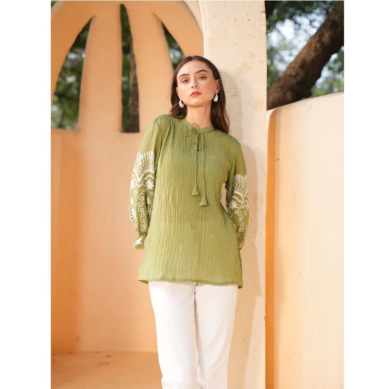 Chemisier en mousseline de soie vert brodé de style luxueux à manches longues pour brunch, shopping et sorties de jour à prix de gros