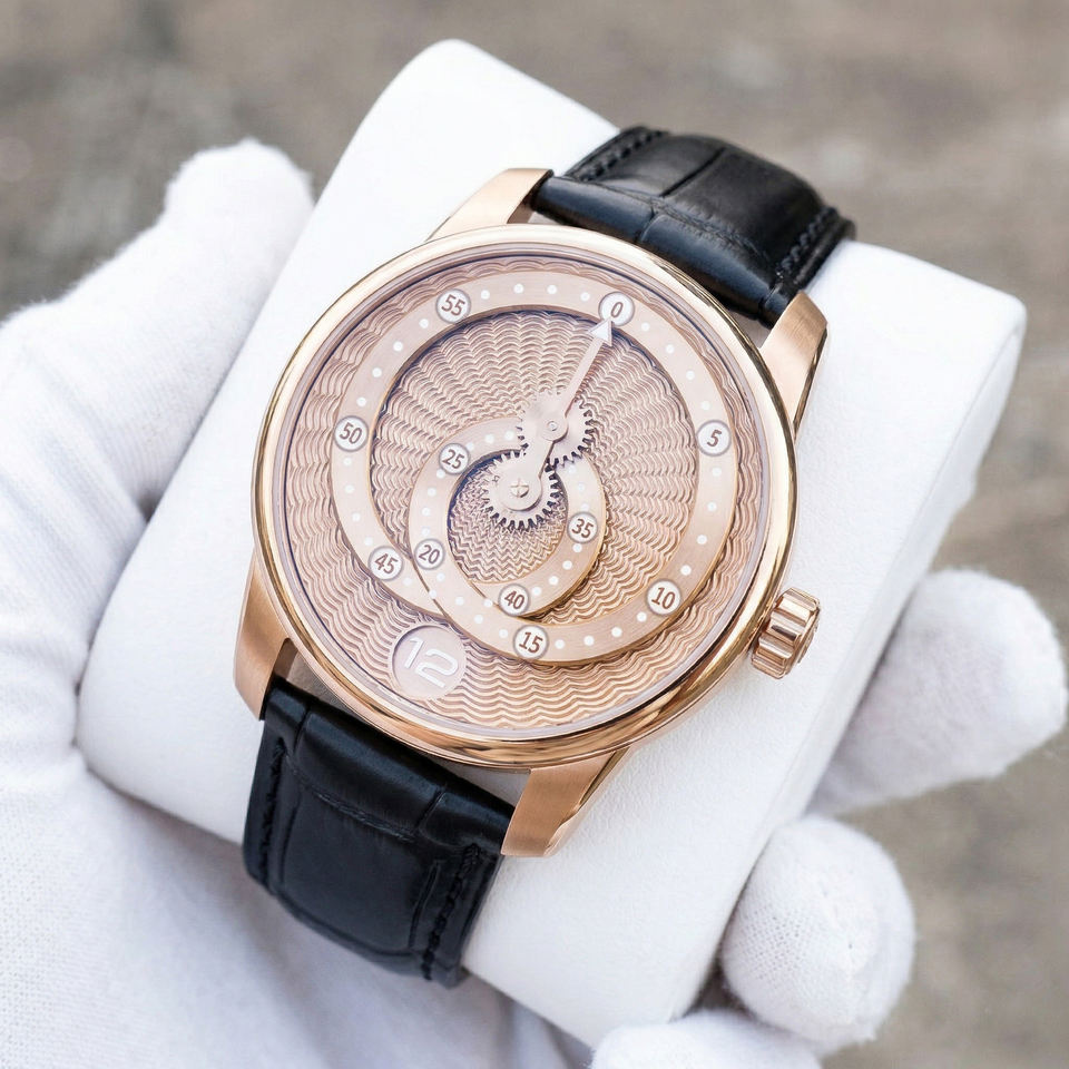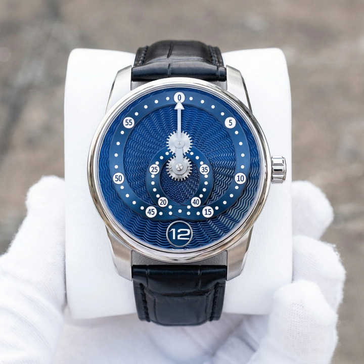 OEM ODM Custom Mechanical Automatic Wandering Hour Movement Watch Heart Star Orbit Telescopic Rotating Hand Blue Guilloche Dial