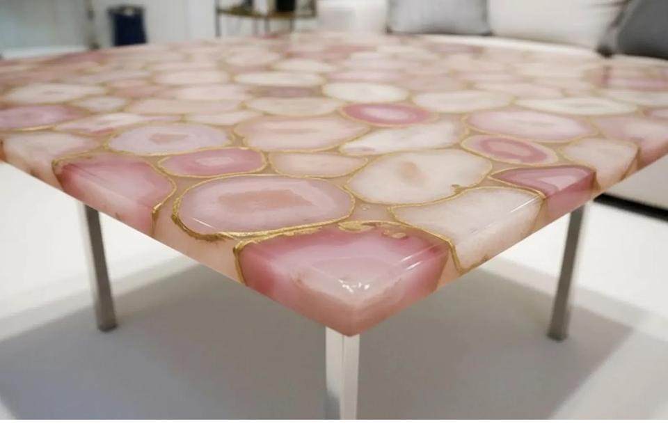 Ensemble de table à manger de luxe, fait à la main, magnifiques pierres semi-précieuses translucides roses, table polie, grande dalle, agate rétroéclairée, meubles