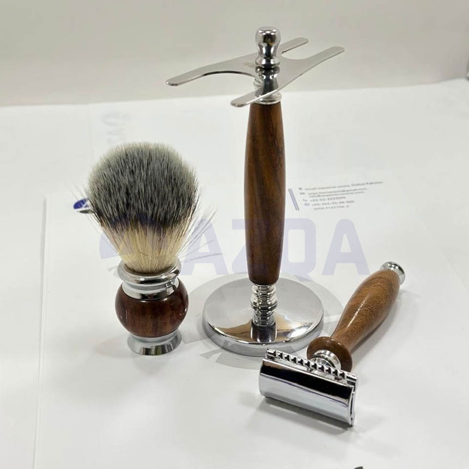 Kit de rasage de luxe avec rasoir de sécurité à double tranchant, brosse et support en bois – Ensemble de rasage professionnel pour barbier