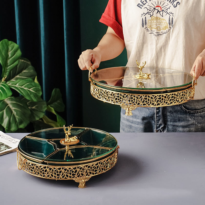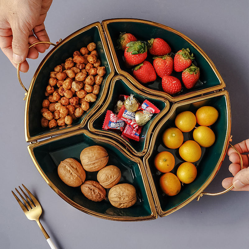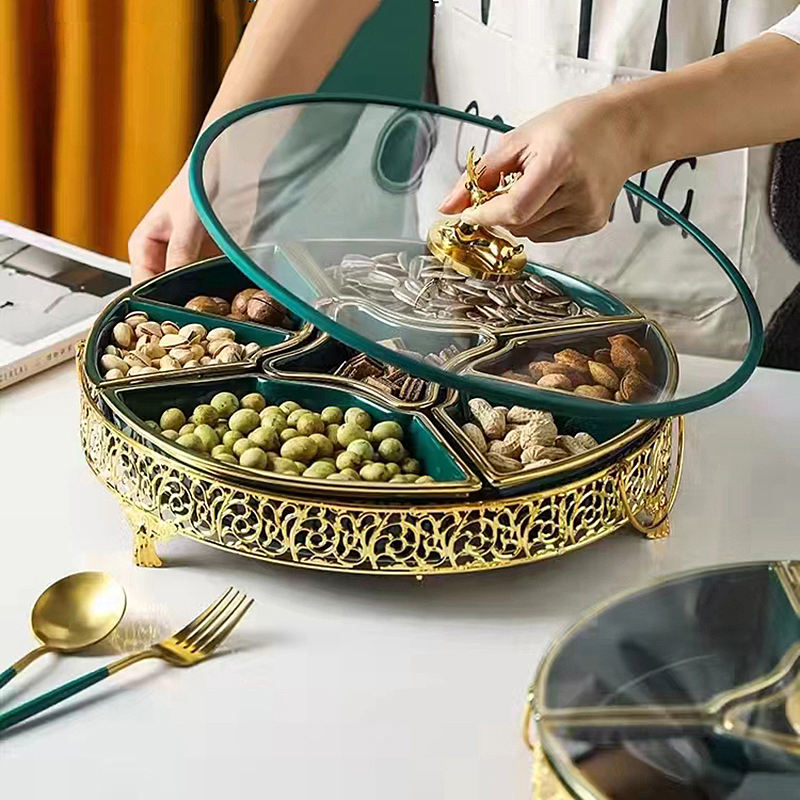 Plats de service en céramique de luxe pour la livraison directe, plat divisé avec support en métal, couvercle en verre, assiettes à fruits secs, plateau de service