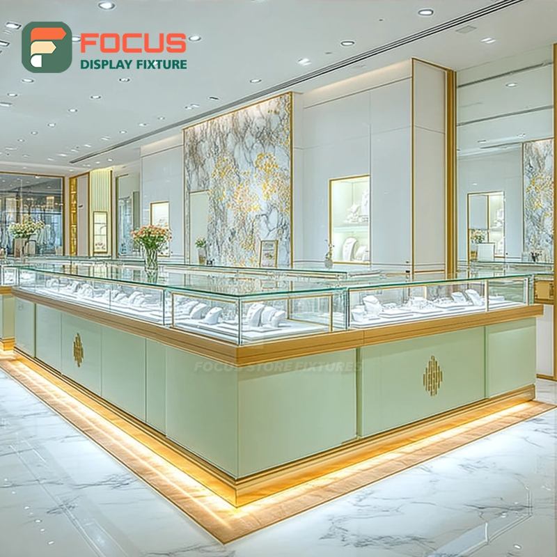 Comptoir de présentation de bijoux de luxe hors taxes avec finition stratifiée, vitrine commerciale pour magasin
