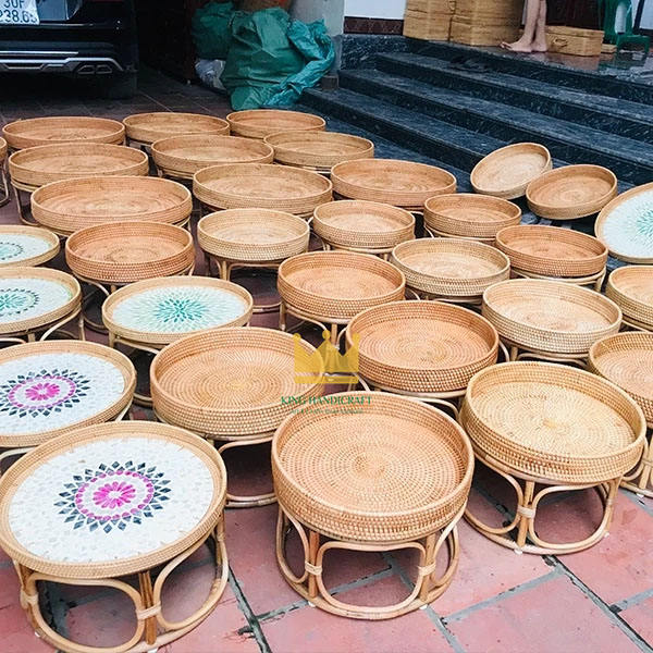 Tables gigognes en rotin écologiques de luxe avec plateau en mosaïque de nacre, ensemble de tables basses rondes pour la décoration intérieure de la maison et des hôtels