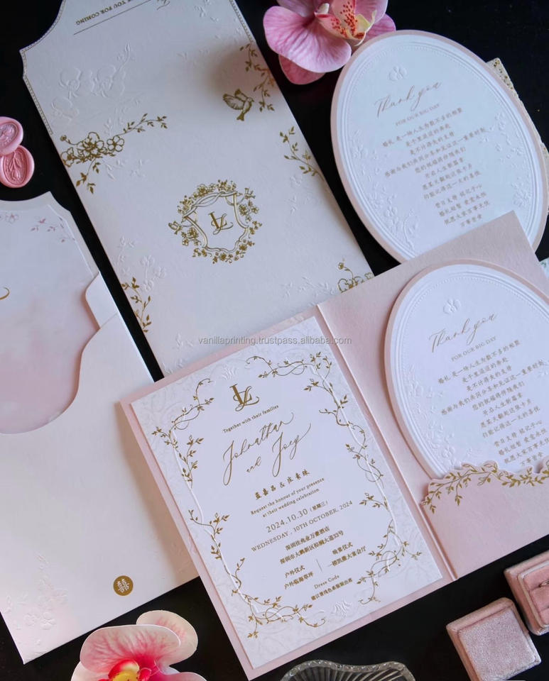 Cartes d'invitation de mariage estampillées de luxe en relief impression sur papier de velours épais découpé à l'emporte-pièce