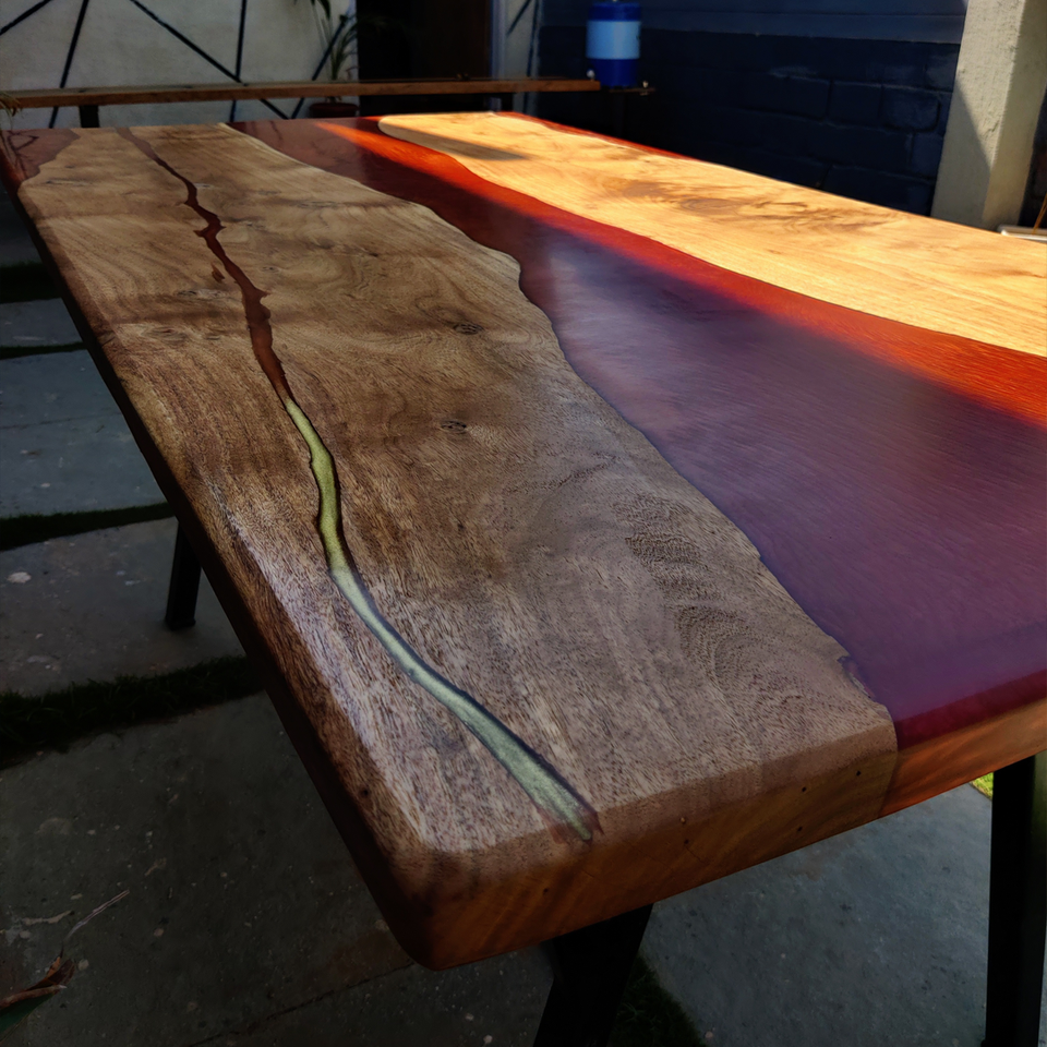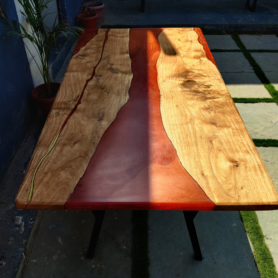 Table à manger moderne en résine époxy de luxe, finition rouge perle orange, écologique, faite à la main, durable, multi-usages, entrée d'hôtel