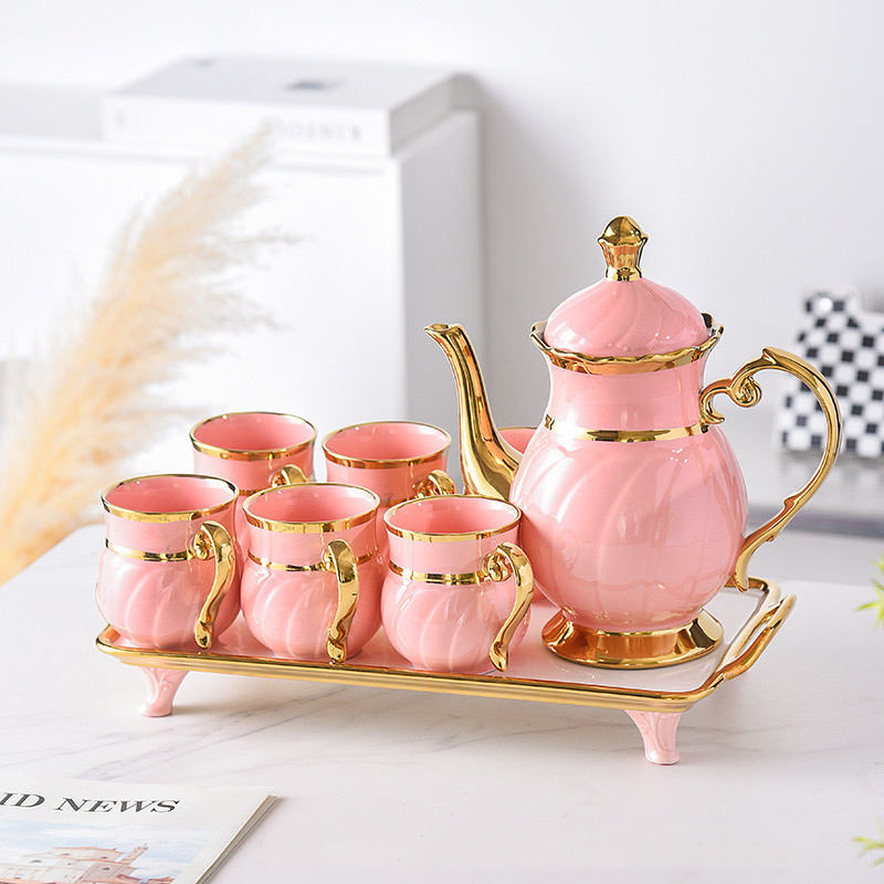 Ensemble de café et de thé en porcelaine de luxe au design européen avec bordure dorée, théière et plateau, respectueux de l'environnement