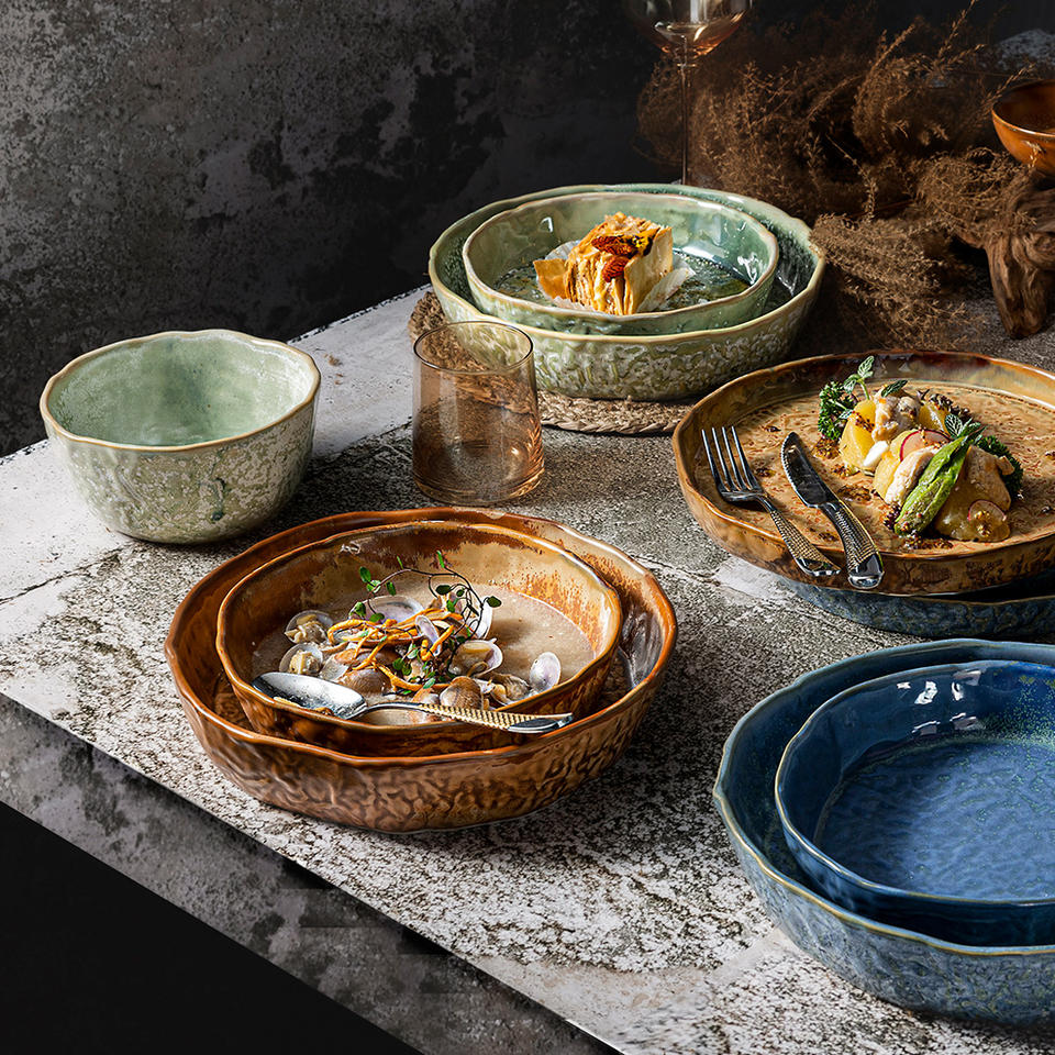 Assiettes de restaurant en porcelaine verte de luxe style européen en vrac Finos belle glaçure couleur plat rond Lamian Risotto