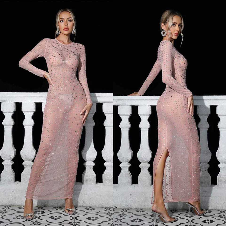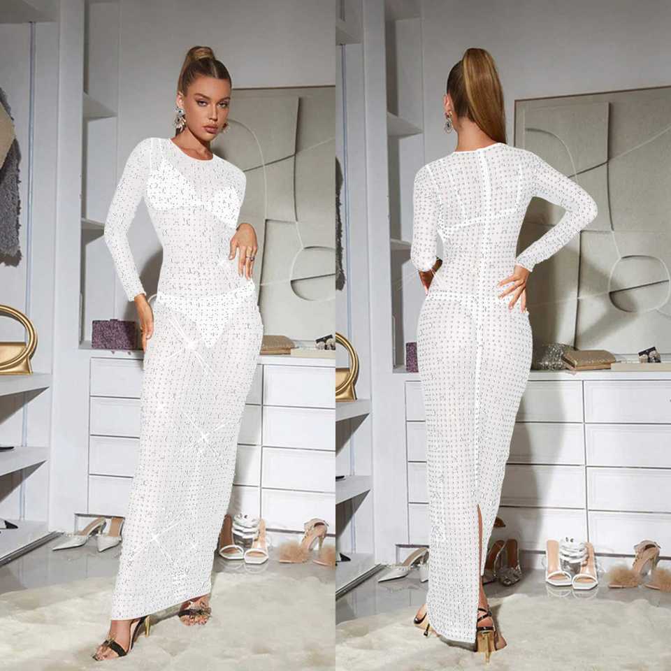 Robe longue de soirée de luxe pour femme, de marque célèbre, brodée, en gaze, avec strass, à manches longues, pour club et mode