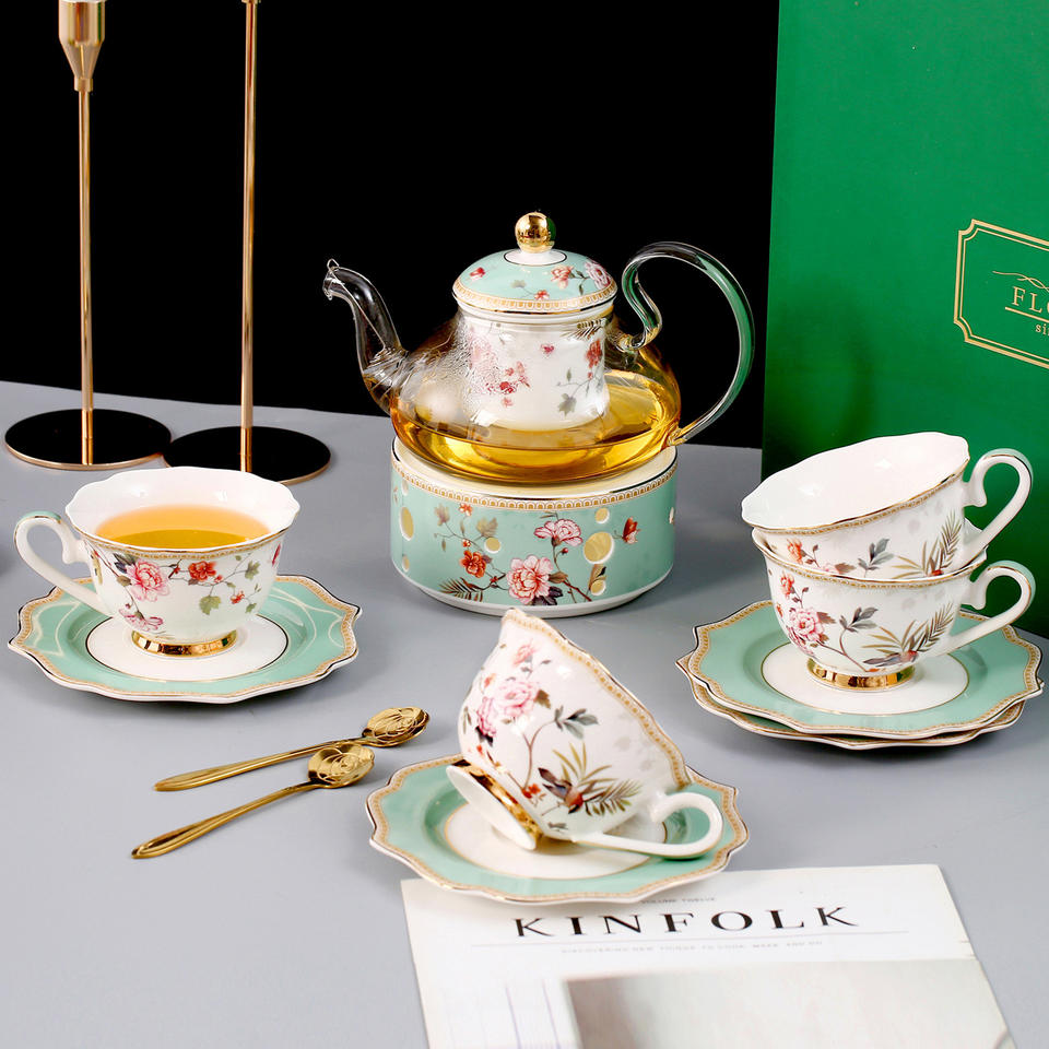 Service à thé en céramique de luxe à motifs floraux et d'oiseaux, théière en verre avec base chauffante, service à thé européen pour l'heure du thé et les cadeaux