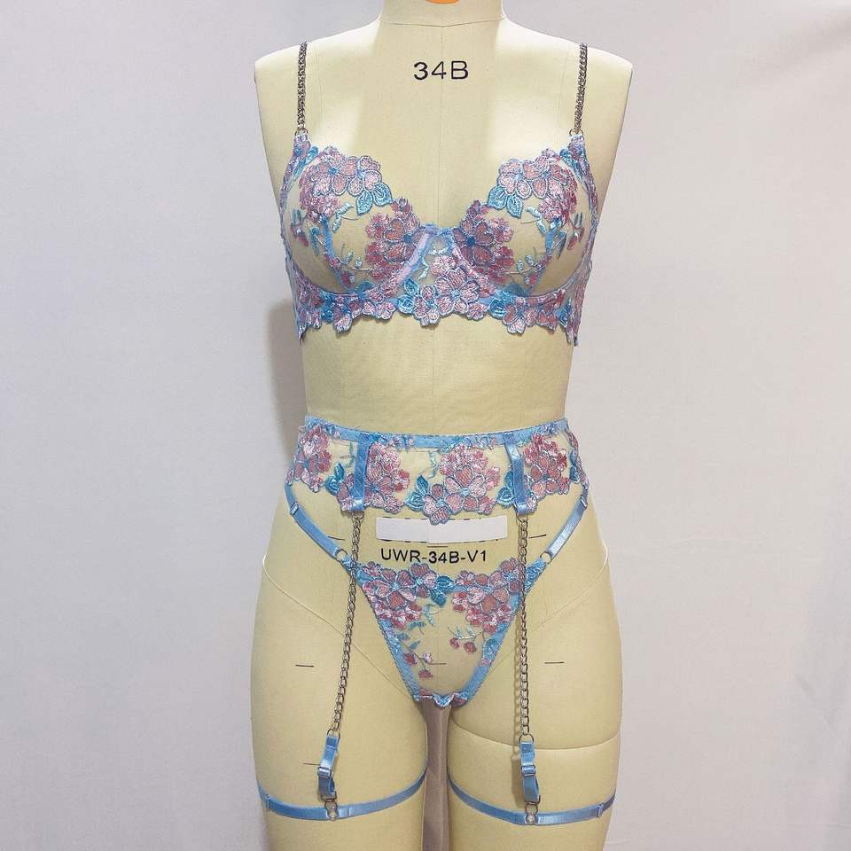 Ensemble de Lingerie Sexy de Luxe avec Broderie Florale, Soutien-gorge à Chaîne Métallique, Culotte et Jarretelles, Dentelle Sensuelle, Sous-vêtements Push-up, Lingerie Intime