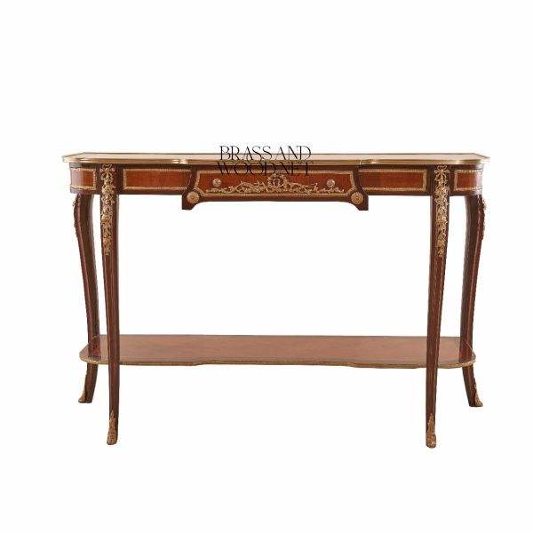 Table console française de luxe en bois artisanal avec étagère inférieure et ornements élégants en laiton, mobilier d'intérieur classique
