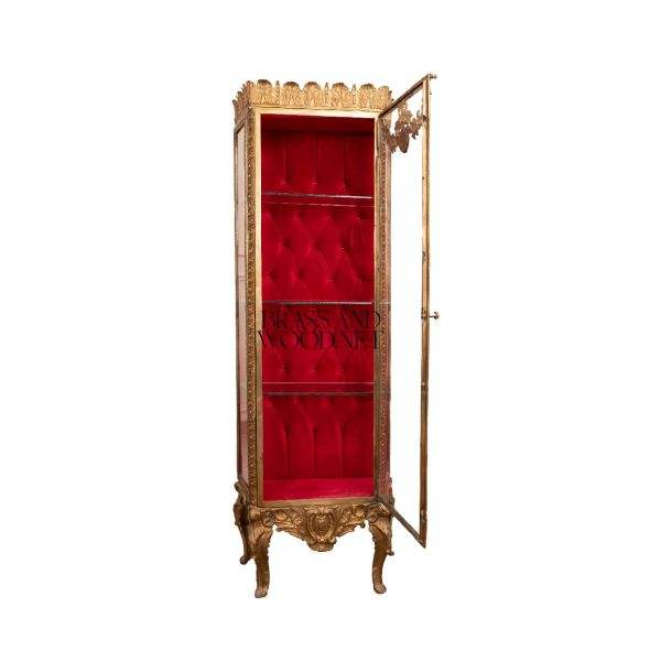 Vitrine d'exposition française de luxe dorée avec intérieur en velours rouge