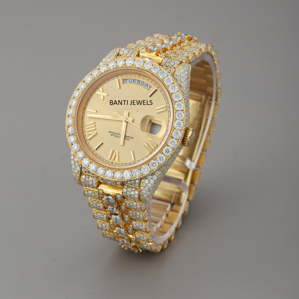 Montre de luxe entièrement sertie de diamants en moissanite, bracelet en acier inoxydable doré, bijoux hip-hop, style brillant de qualité supérieure